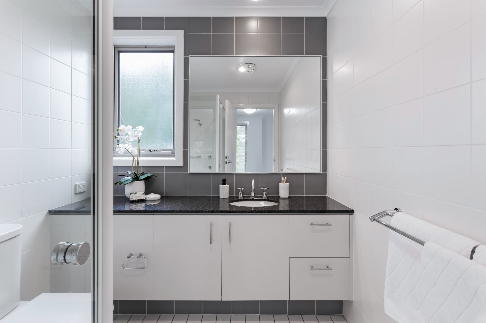 - Stylish bathroom with floor-to-ceiling tiles
