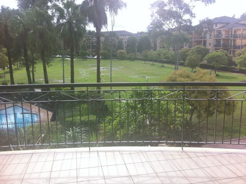 Large open plan living and dining area that open up to sunny balcony over looking the park and pool.