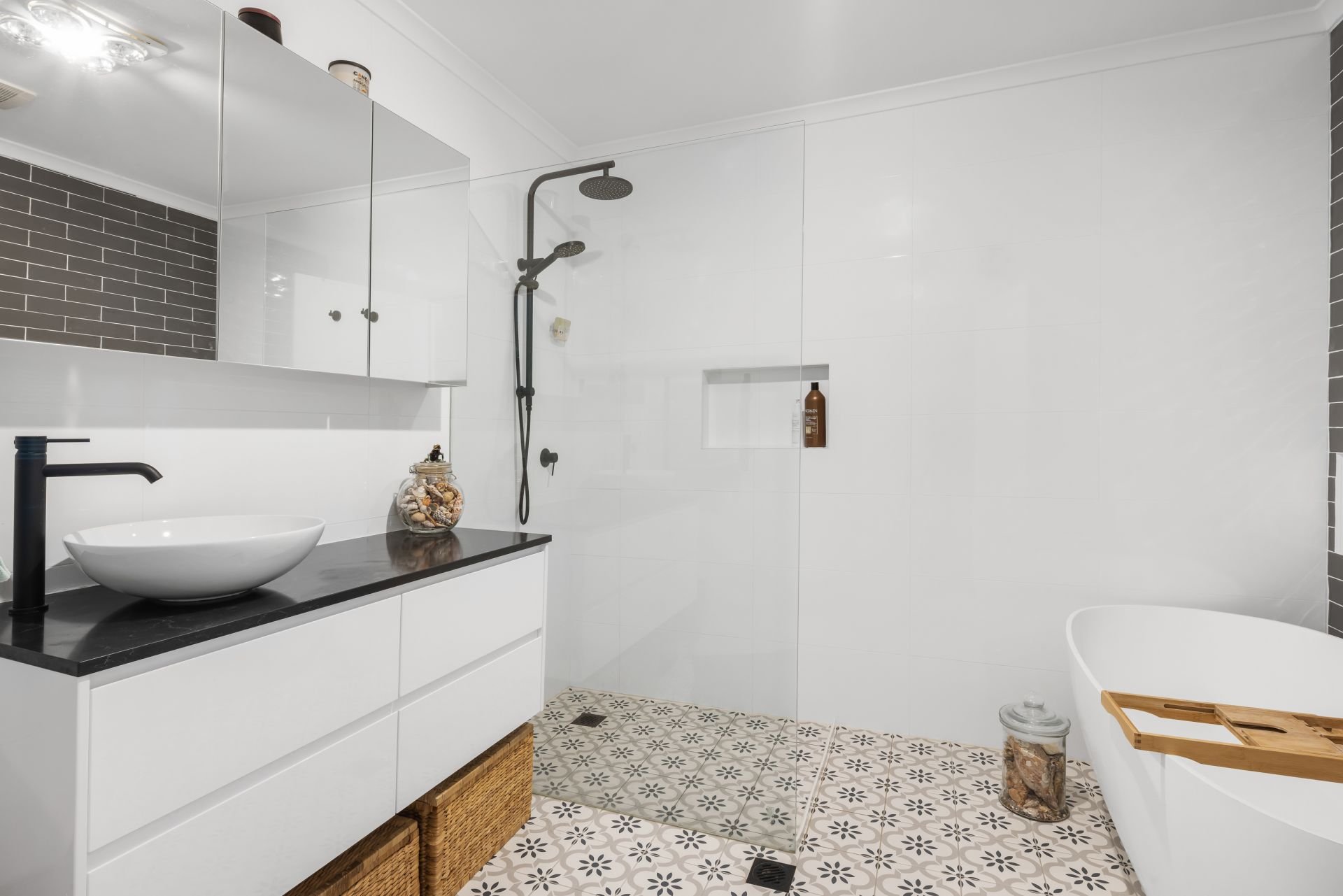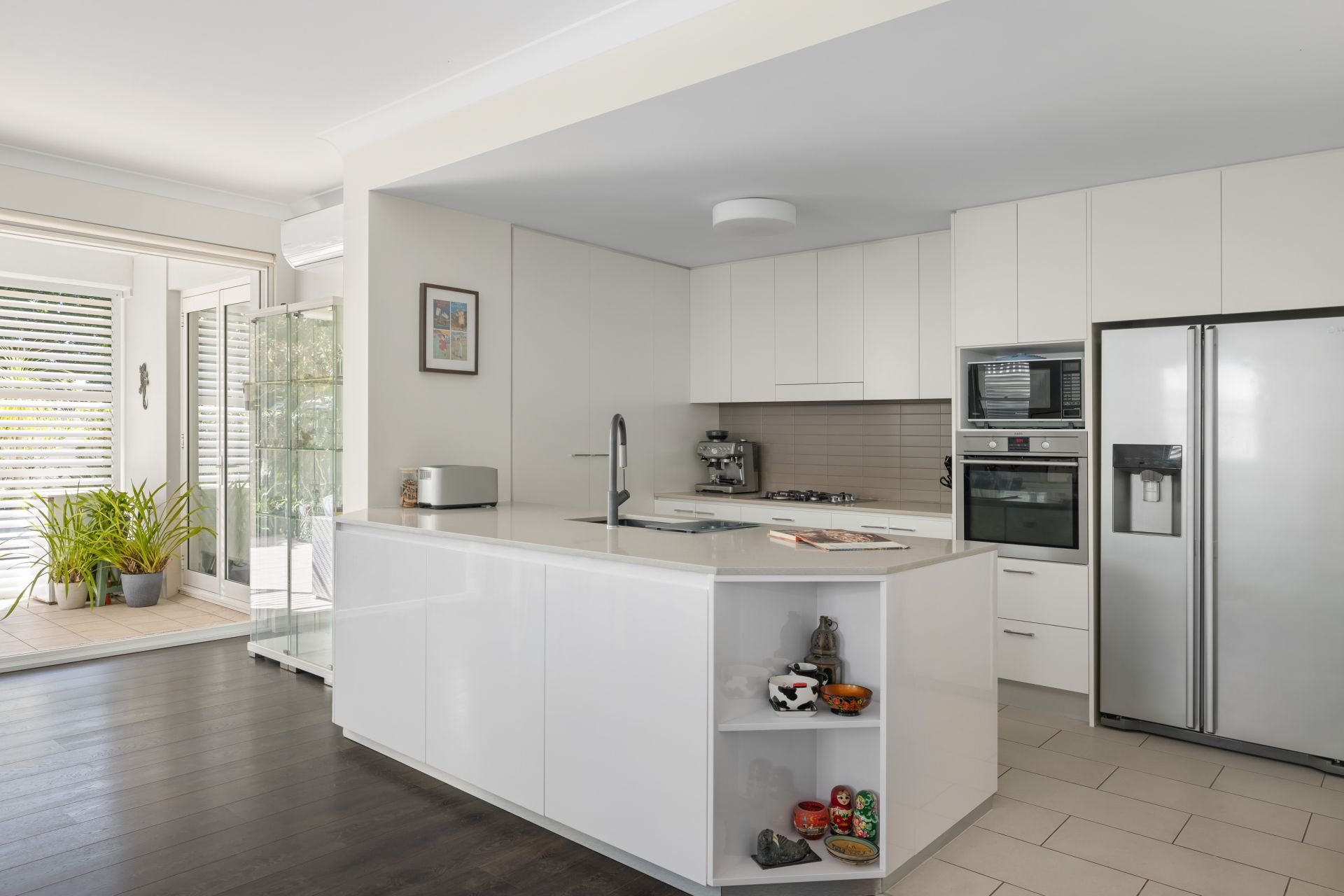Modern white kitchen with a stone island bench