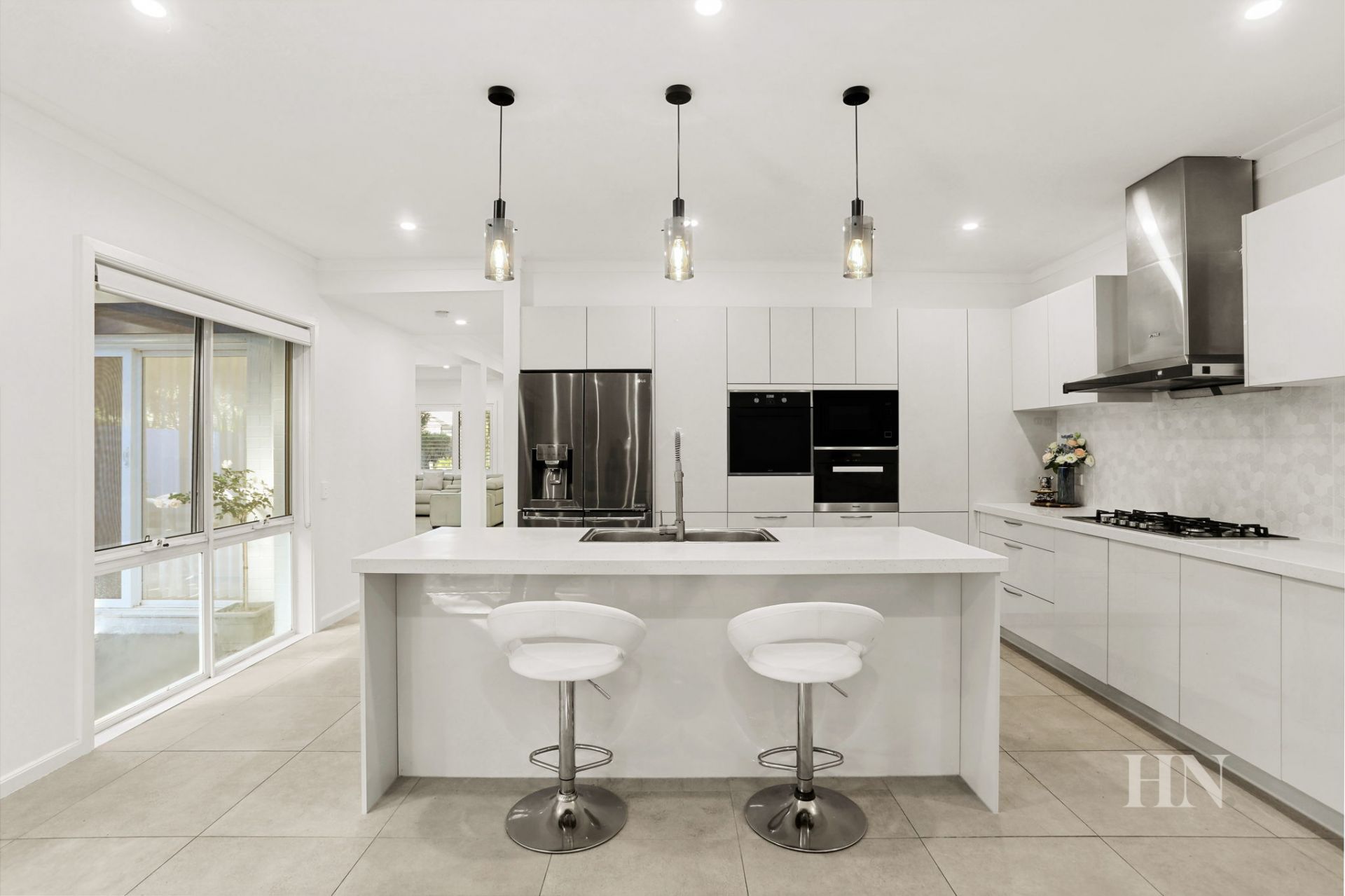Expansive gourmet gas kitchen with sweeping stone benches