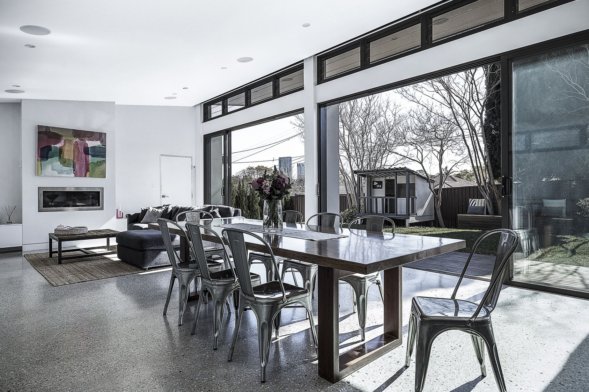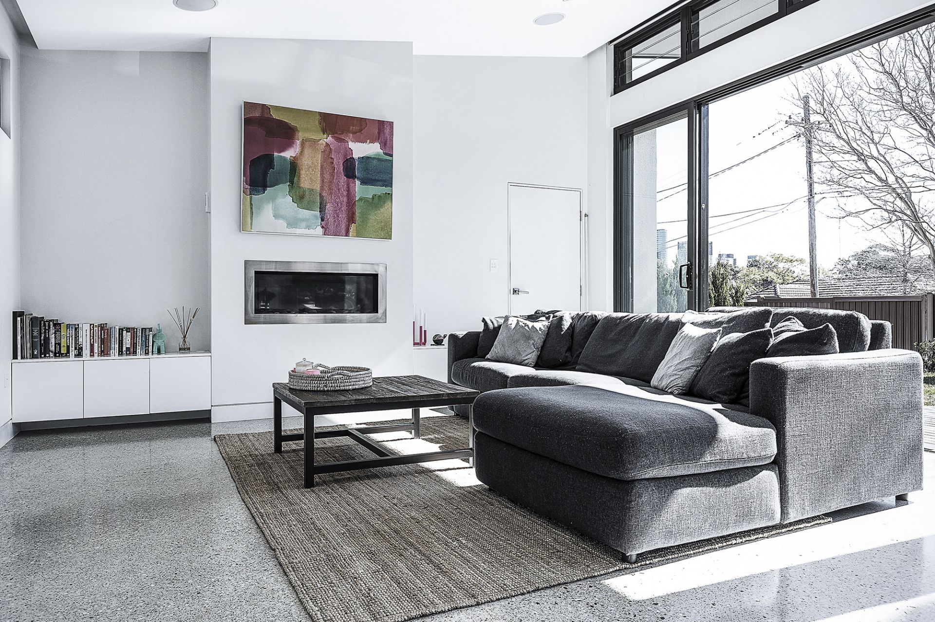- Living areas feature custom polished concrete floors and gas fire place