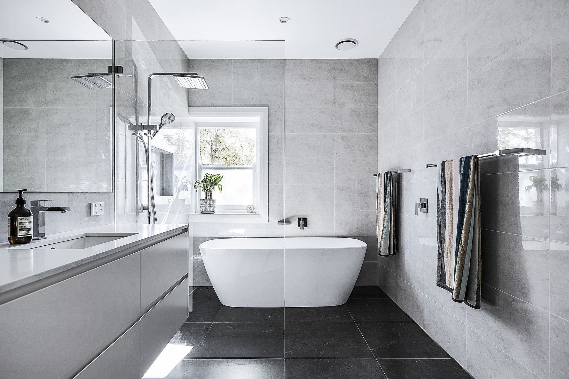 - Huge stylish bathroom with large bath tub and separate shower area