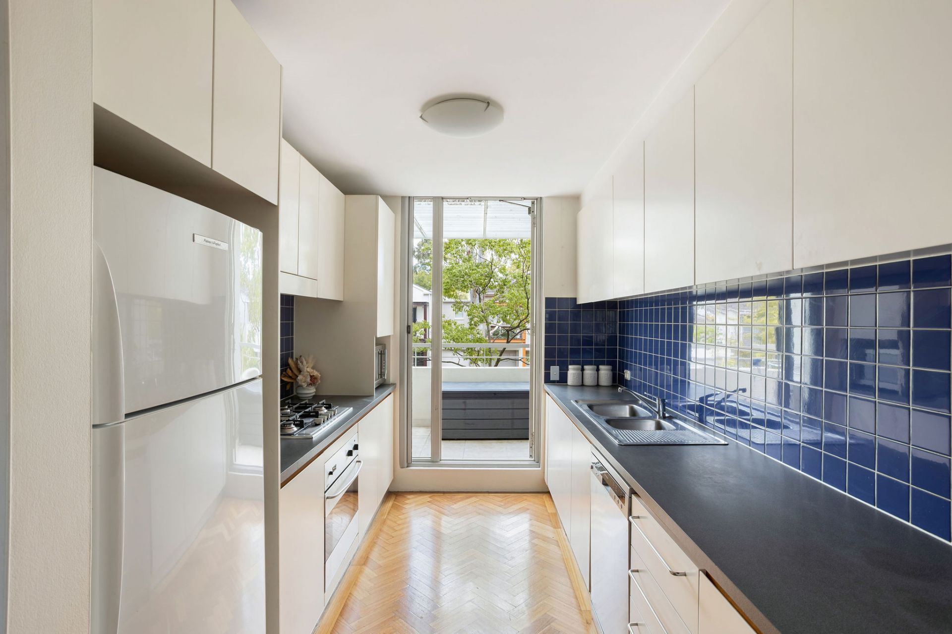Modern kitchen with stone benches and parquetry floors