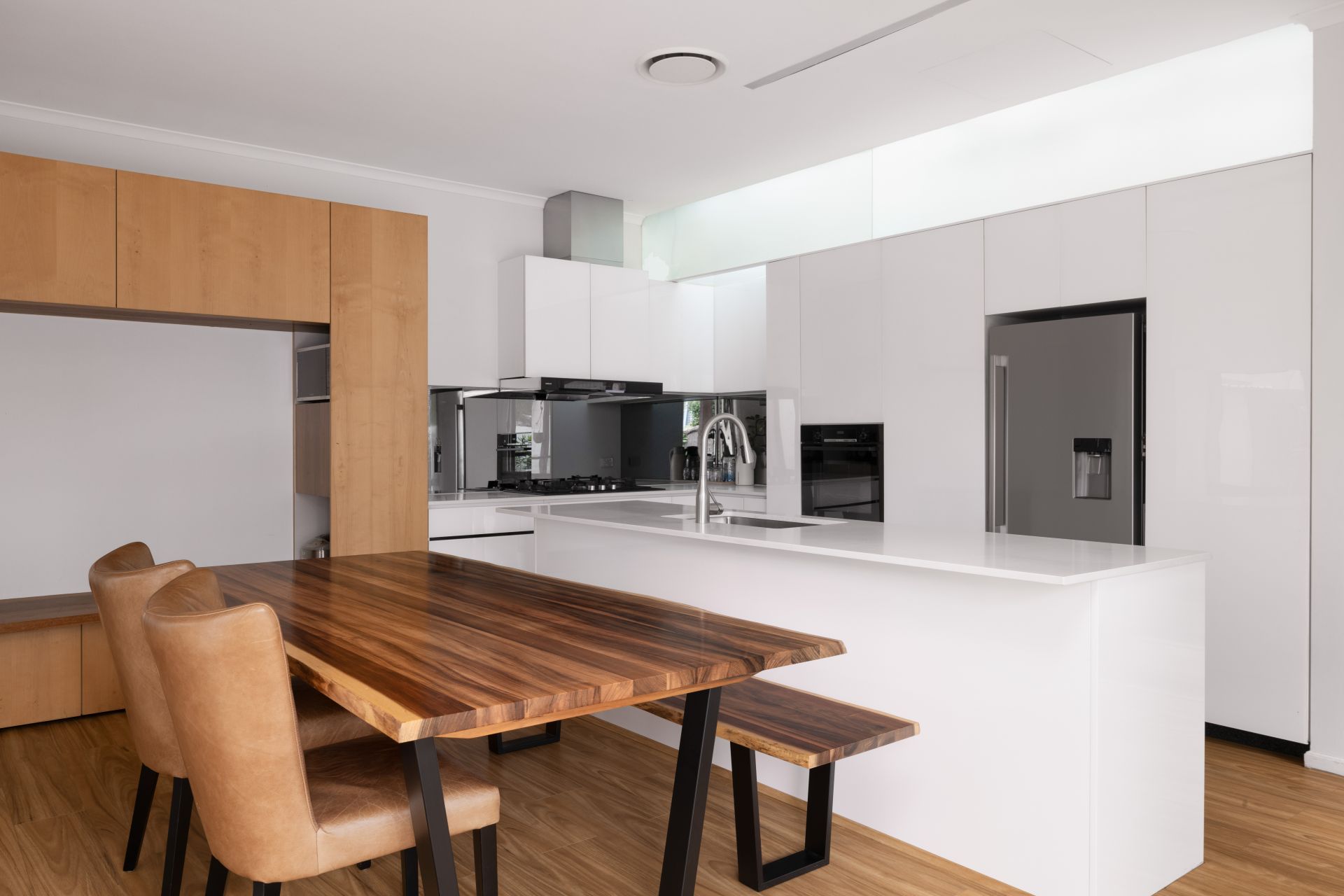 Fresh and bright interiors feature cool timber flooring and crisp decor