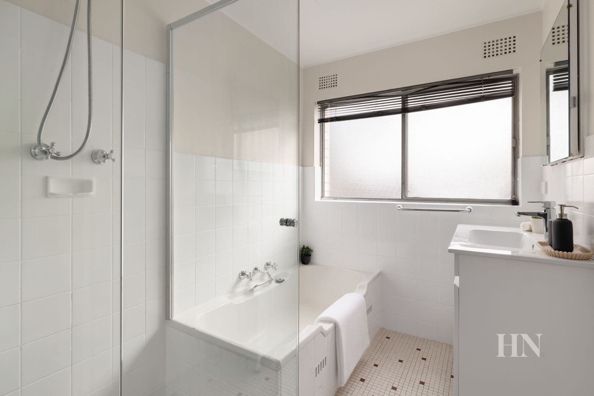 Well-lit full bathroom comes with internal laundry