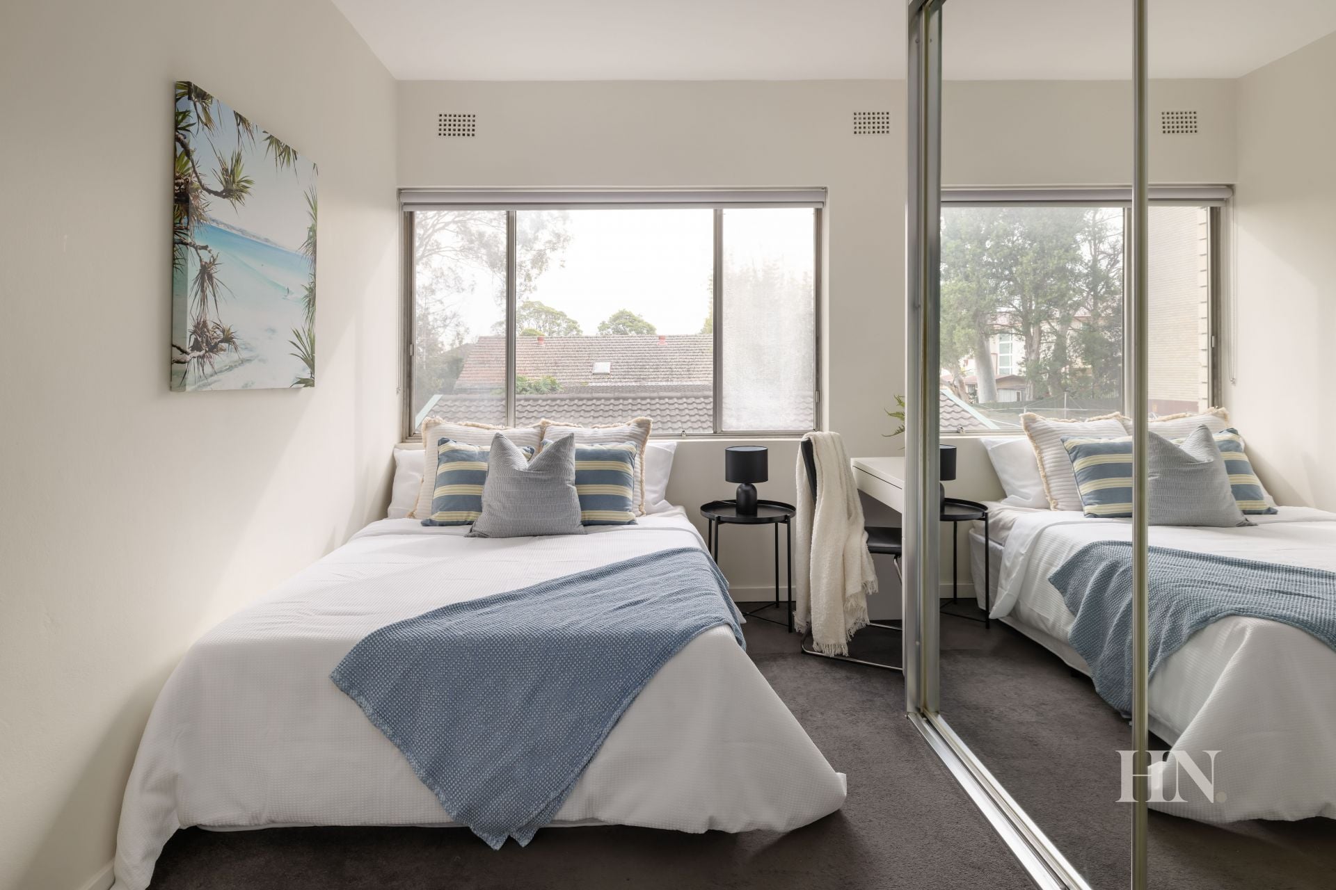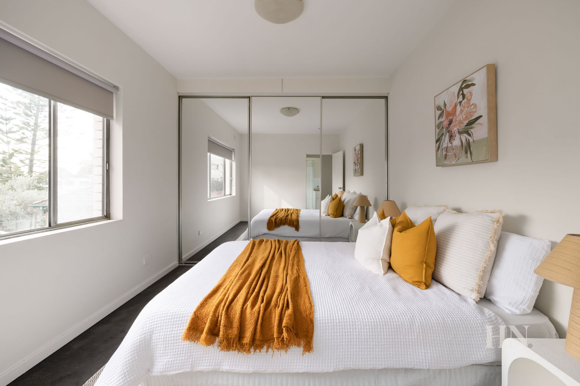 Two peaceful bedrooms both have mirrored robes
