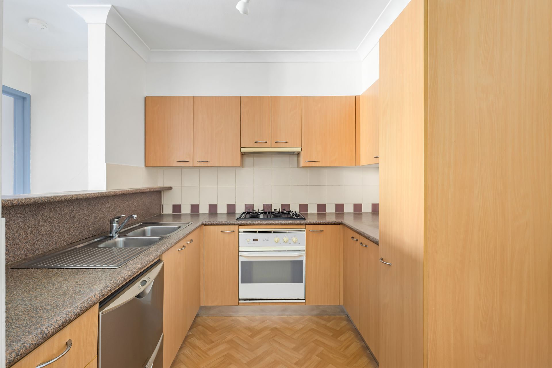 Modern kitchen equipped with stainless steel gas appliances and a dishwasher.