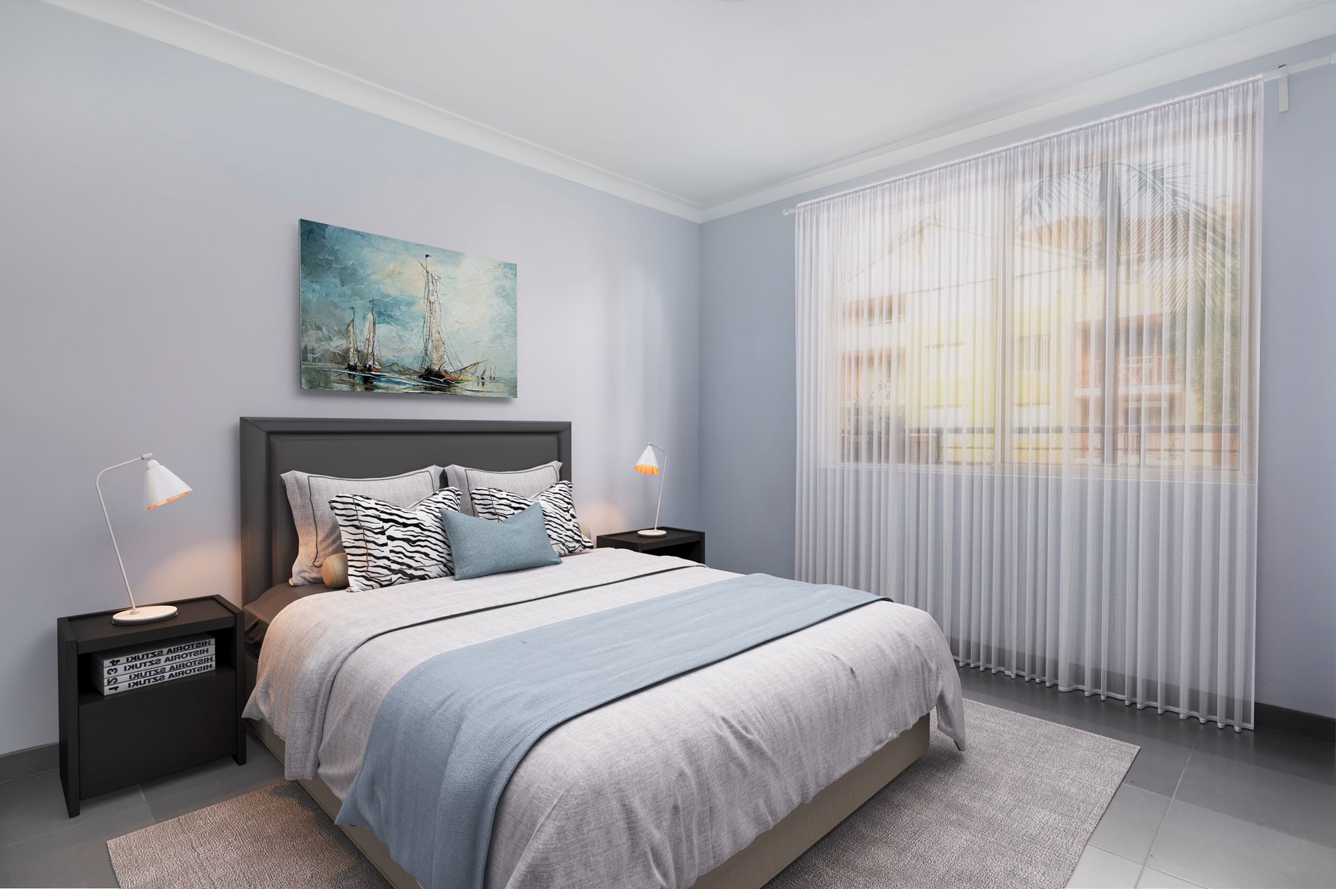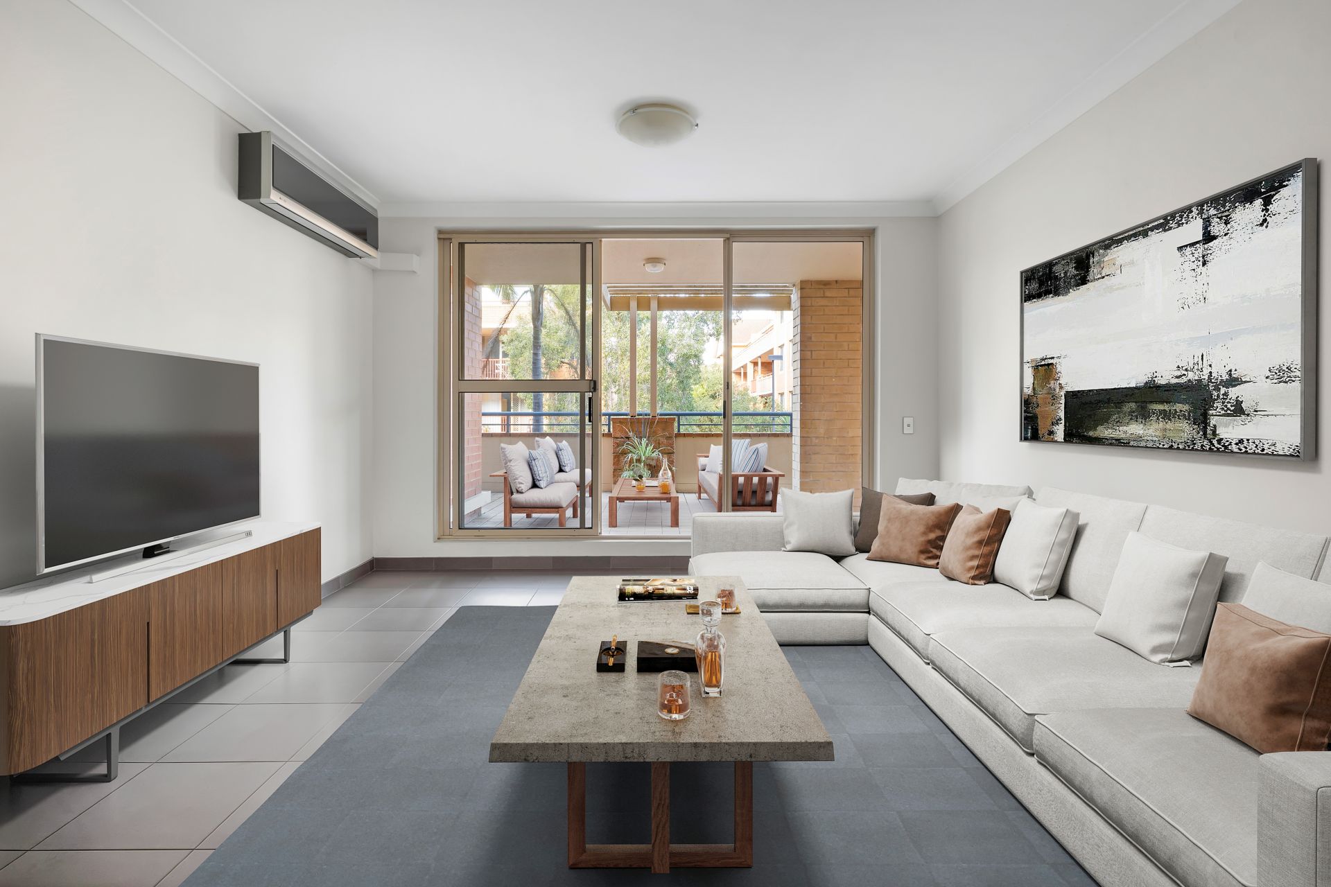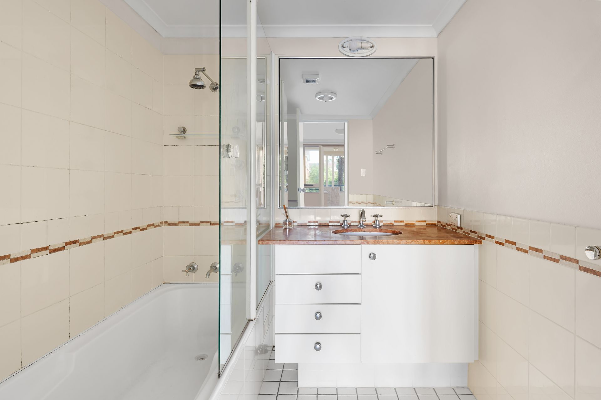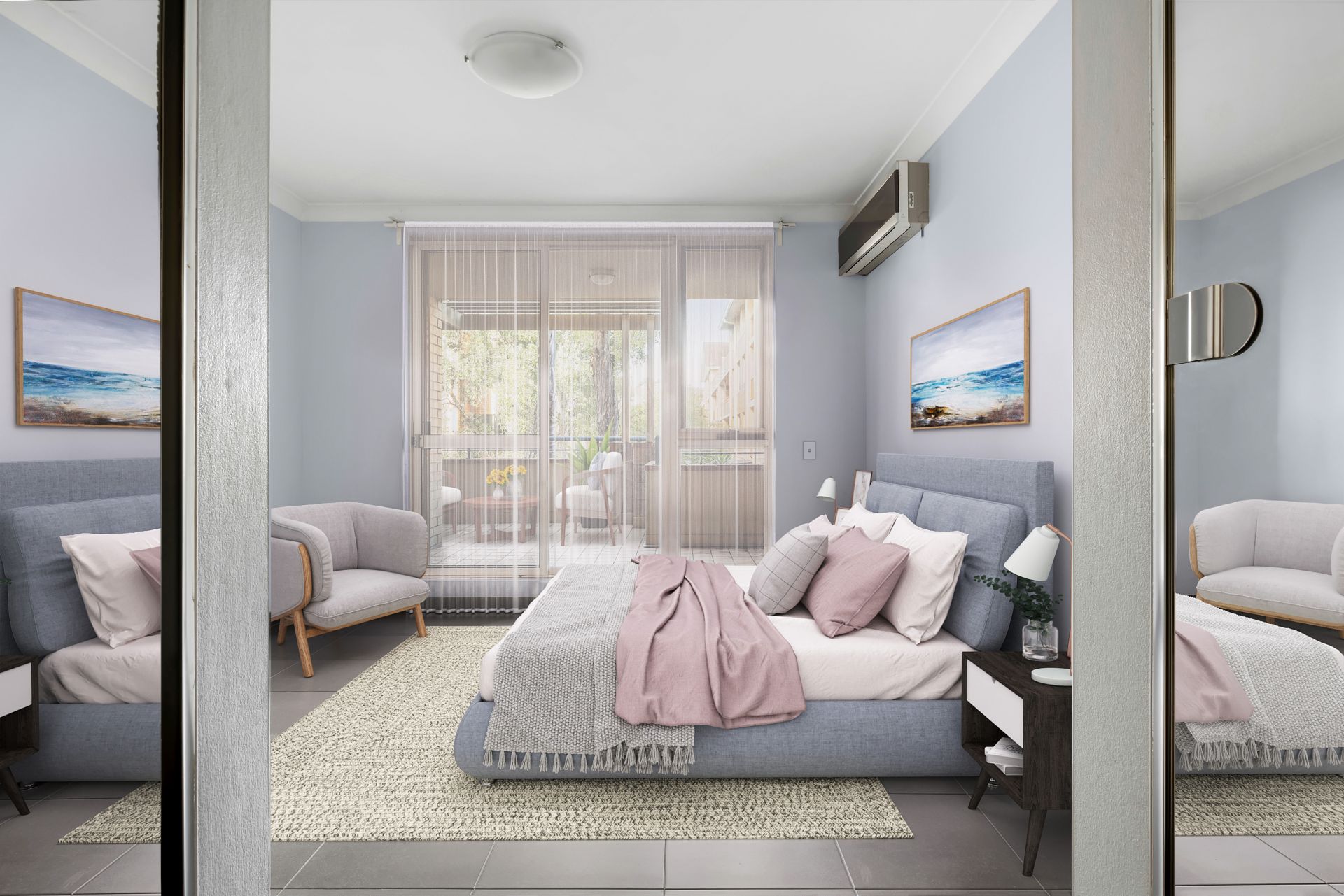 Two generous bedrooms with built-in wardrobes, tiled flooring, vast windows.