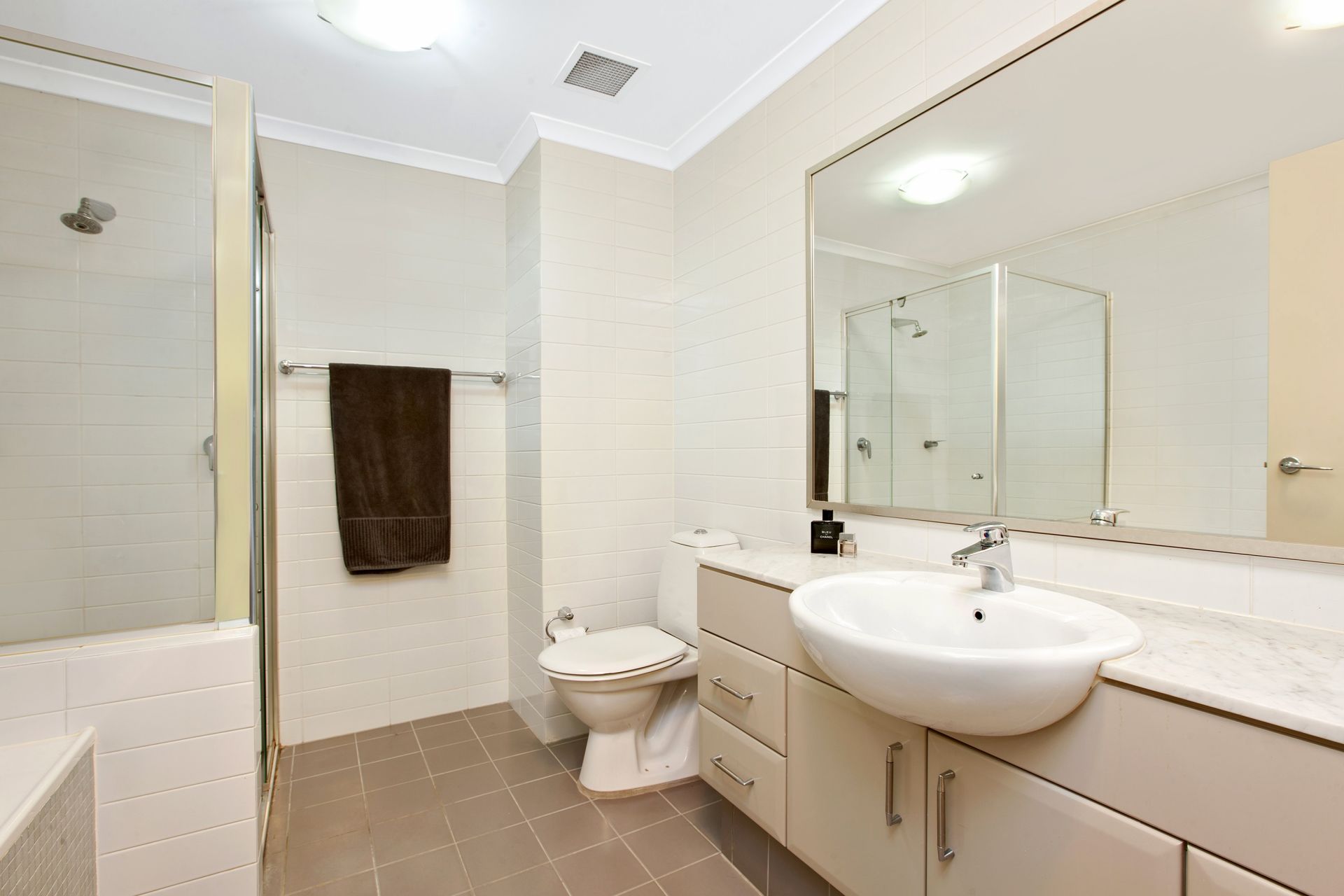 - Pristine contemporary bathroom with a glass shower