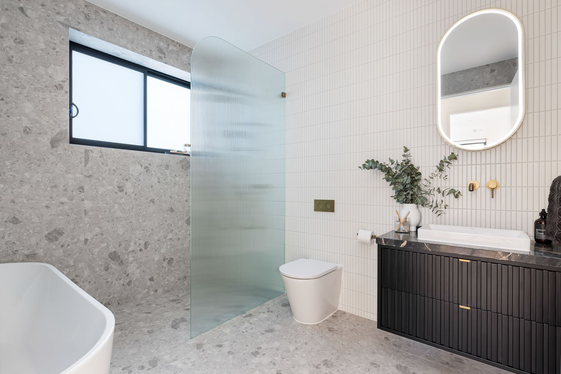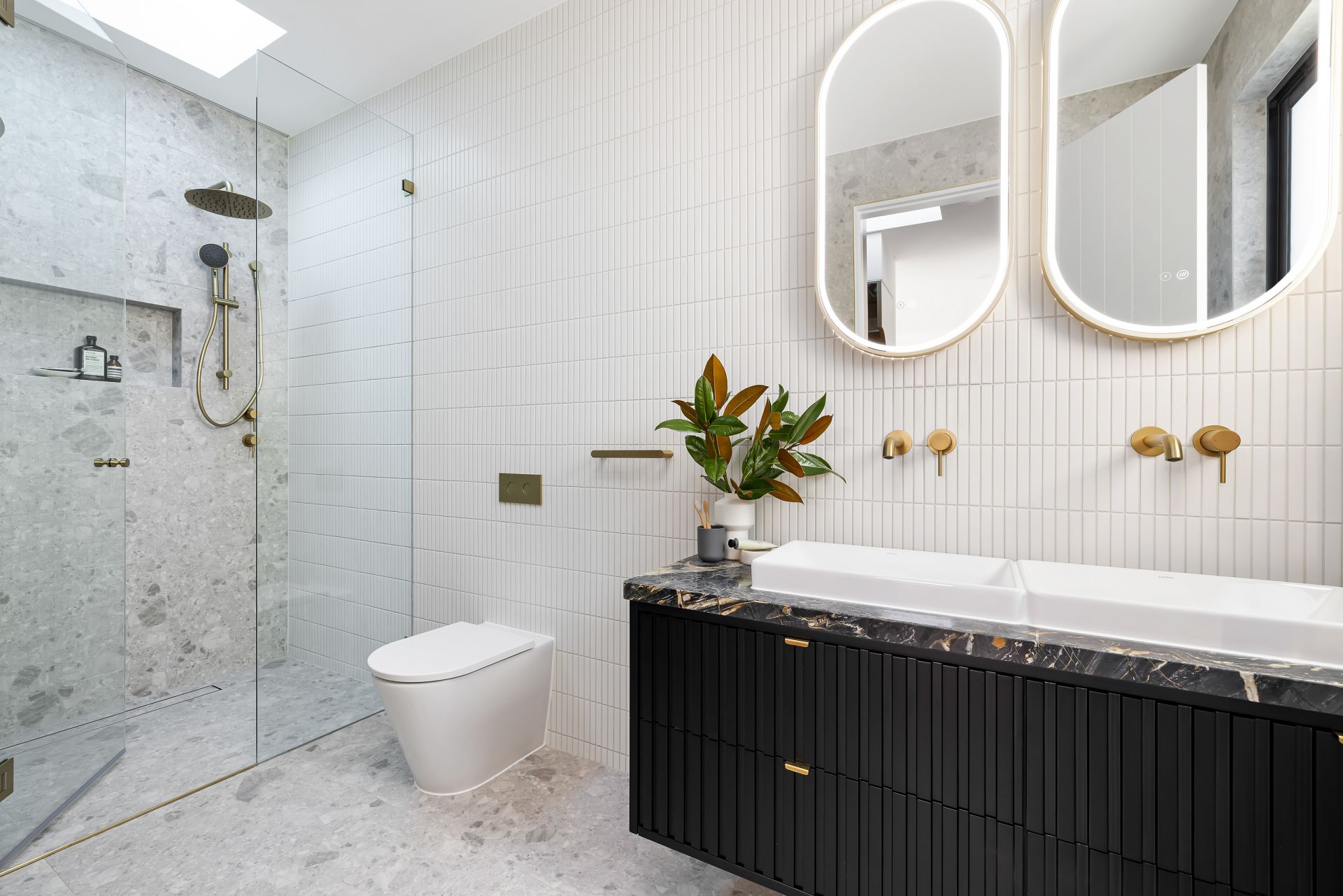 Fully tiled bathrooms, luxurious gold tap fittings