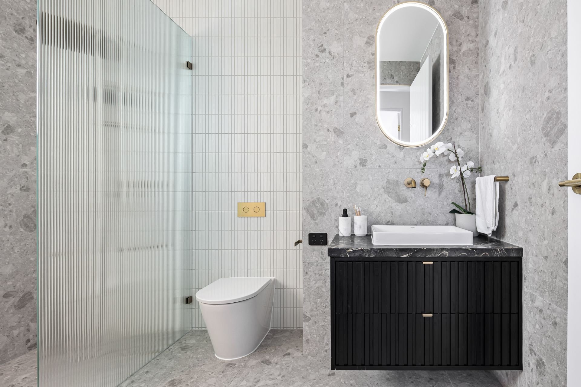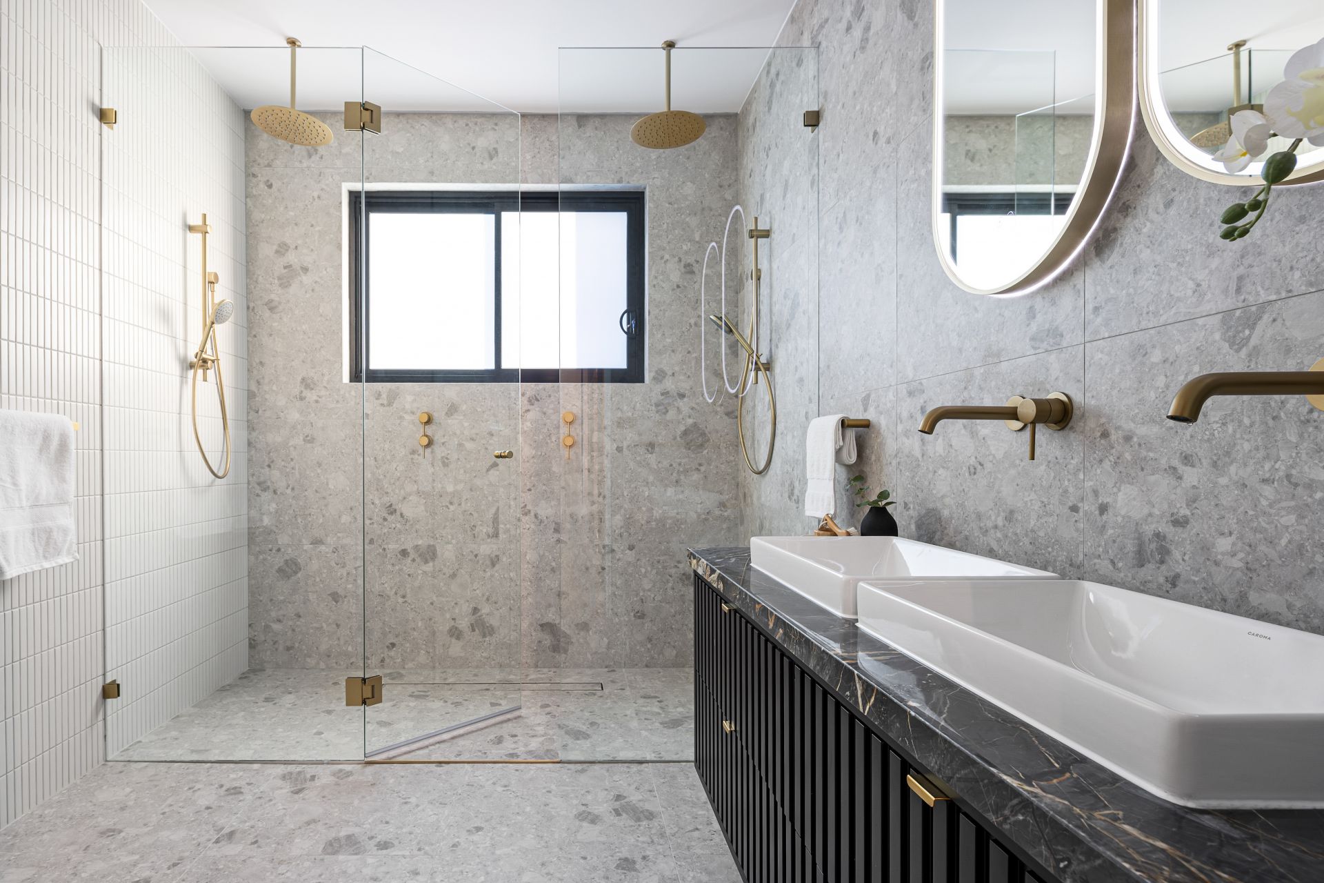 Fully tiled bathrooms, luxurious gold tap fittings