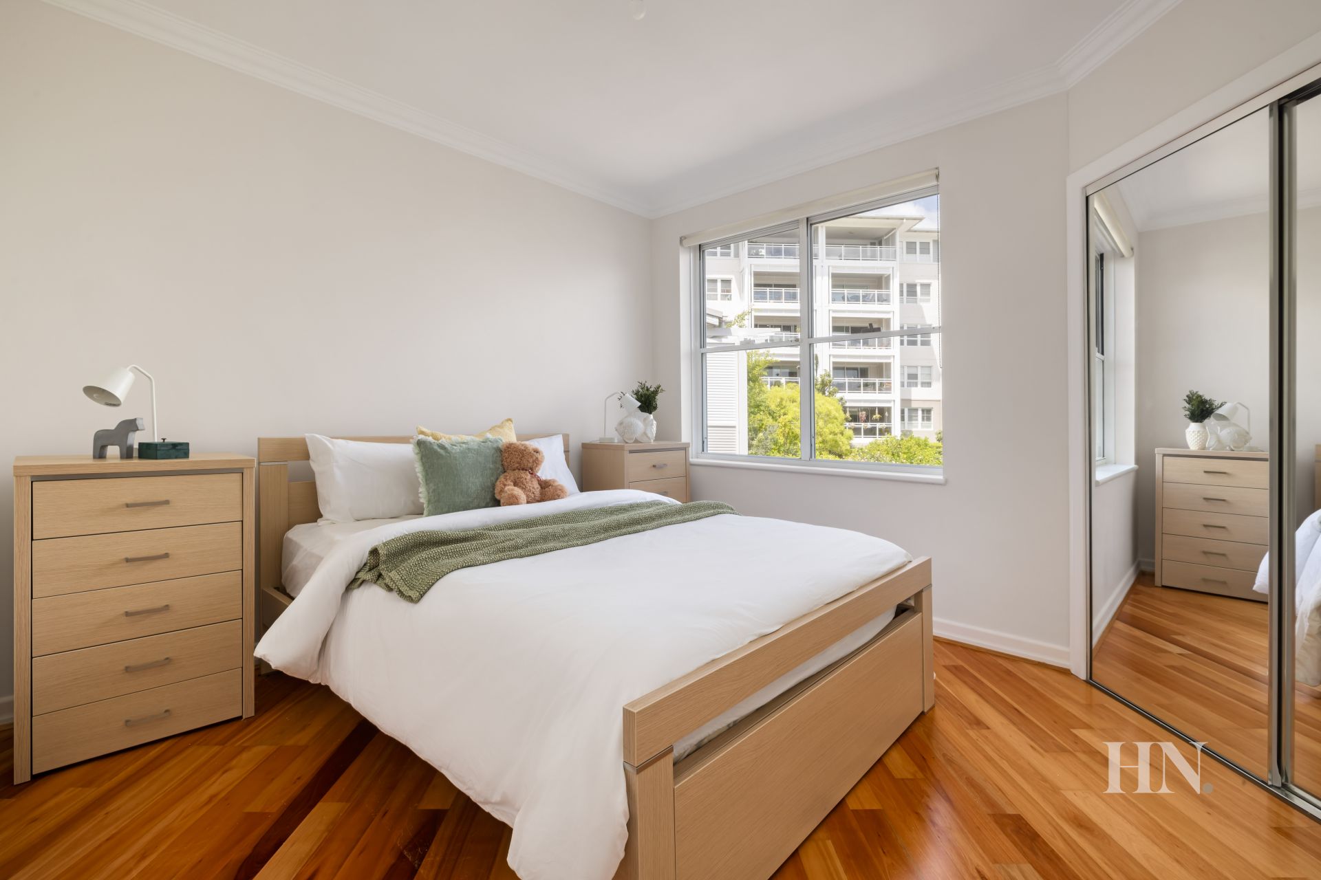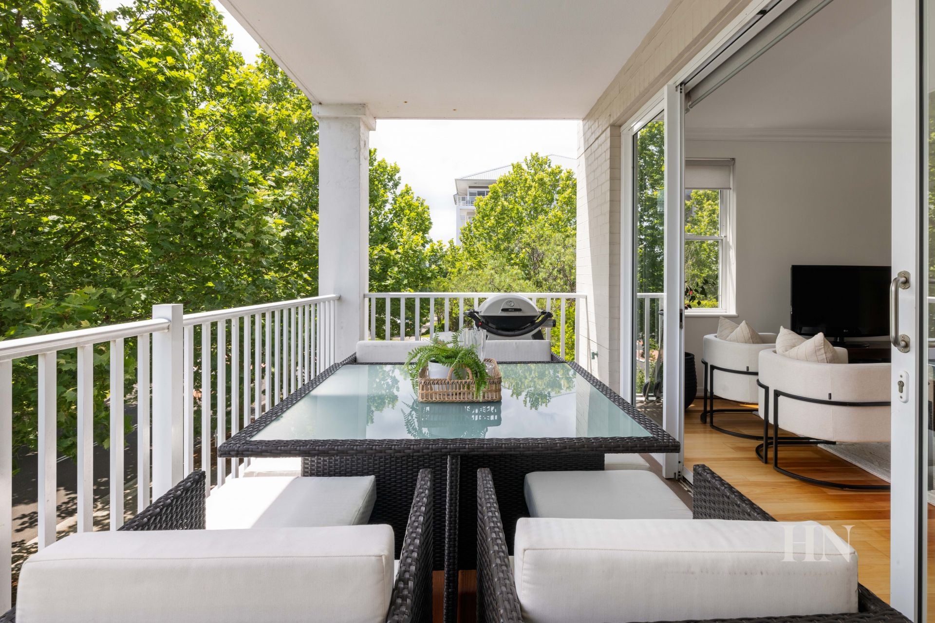 Covered north balcony enjoys a leafy outlook