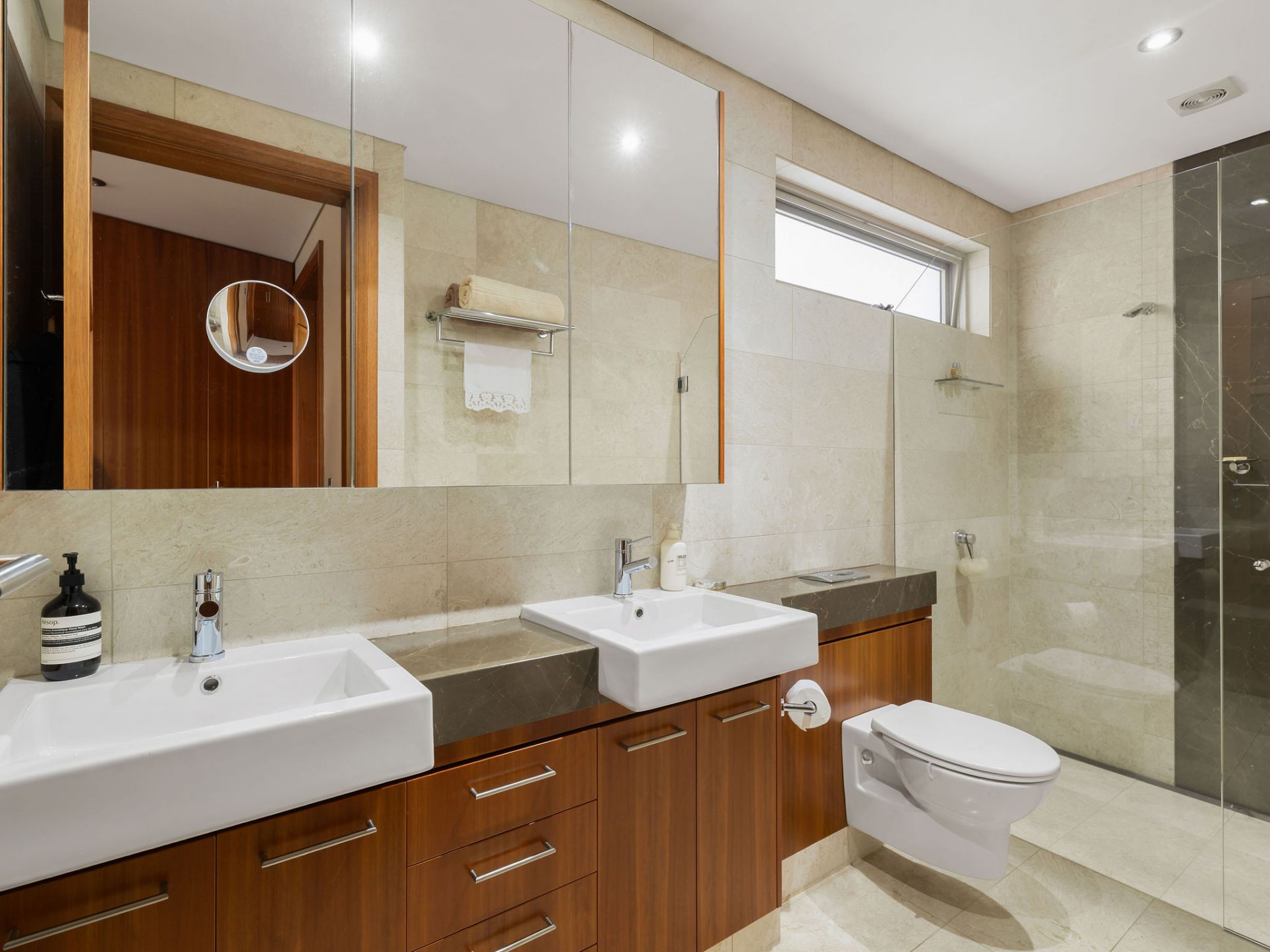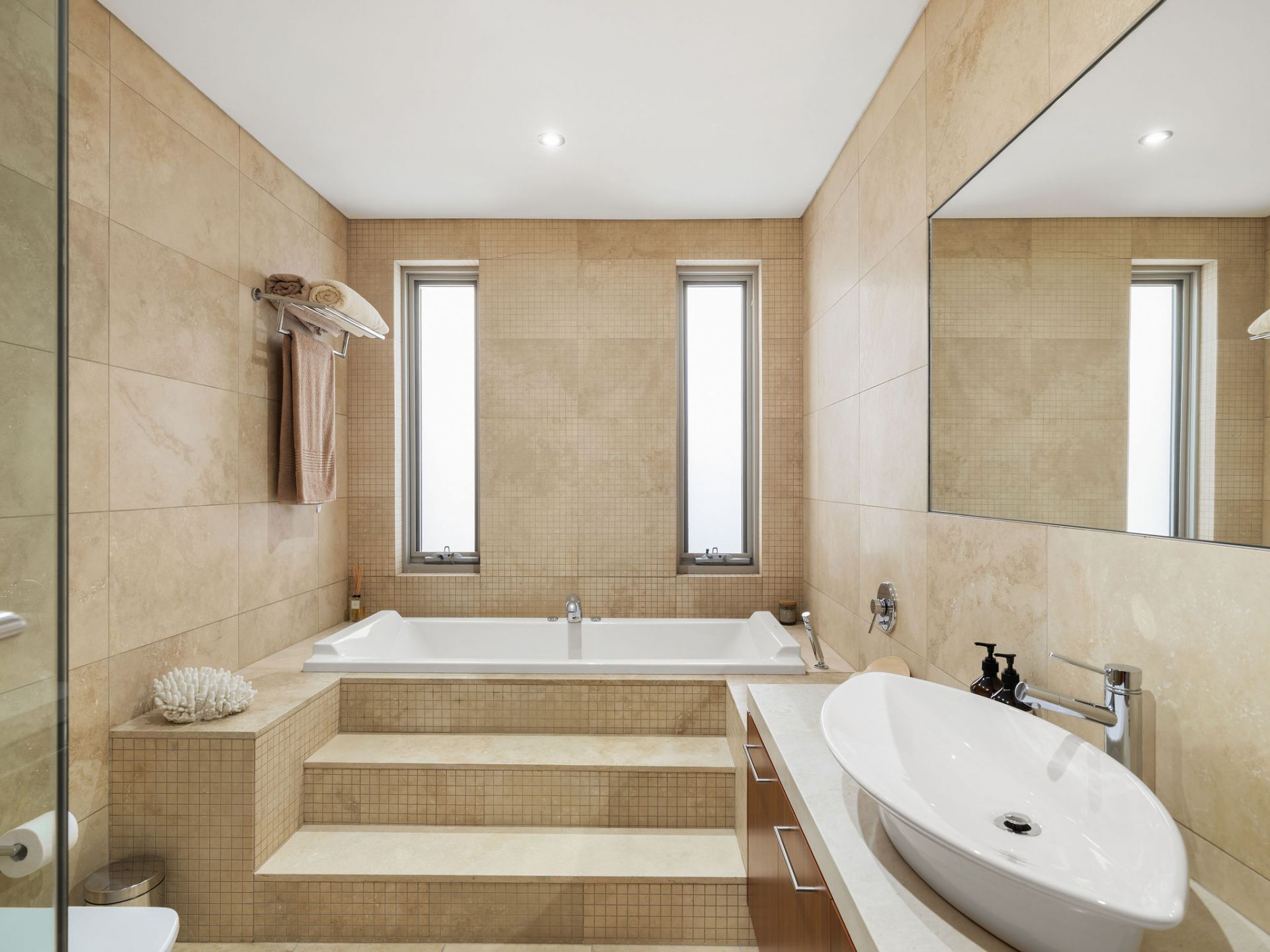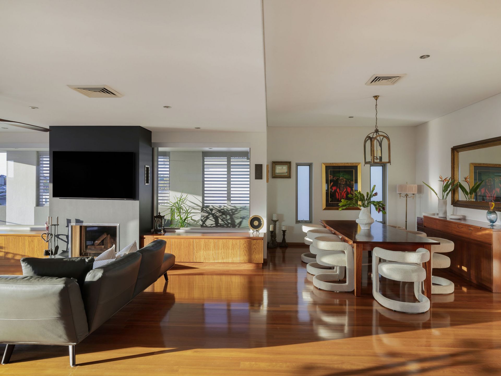 The interiors are defined by 3-metre ceilings, travertine floors, and custom solid timber joinery throughout, including a bespoke home office. Bathrooms feature limestone tiles, Emperador marble and mosaics with underfloor heating, a double shower and sink, walk-in robe, and spa bath in the main suite.