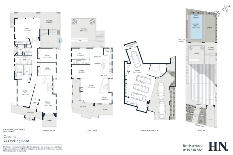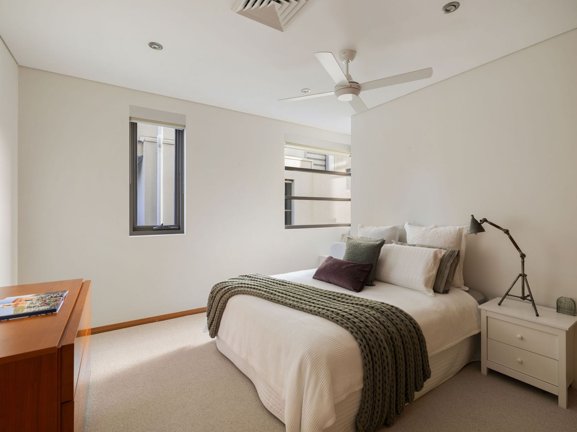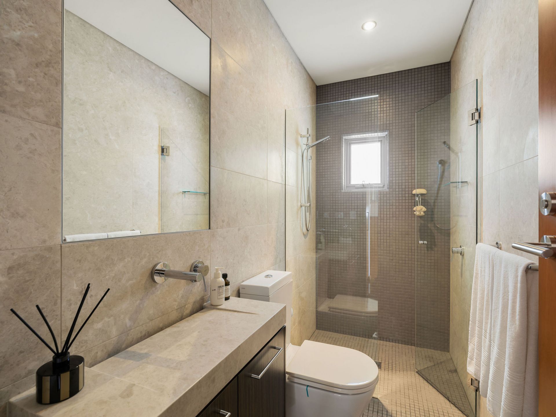 The interiors are defined by 3-metre ceilings, travertine floors, and custom solid timber joinery throughout, including a bespoke home office. Bathrooms feature limestone tiles, Emperador marble and mosaics with underfloor heating, a double shower and sink, walk-in robe, and spa bath in the main suite.