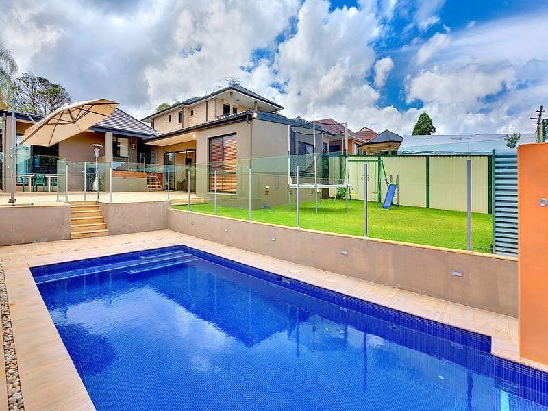 Covered entertaining area overlooking fenced inground swimming pool + outdoor shower.