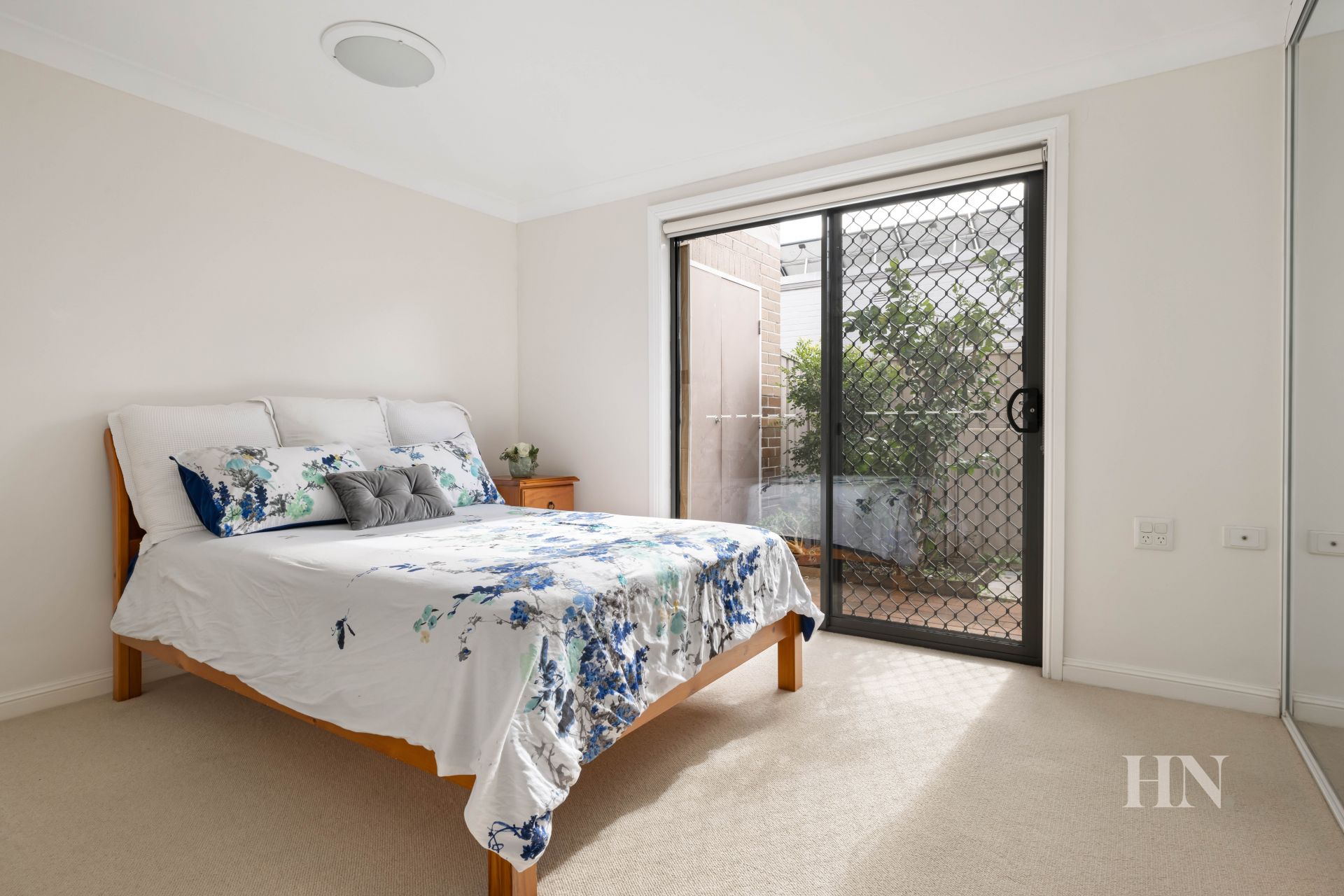 A peaceful double bedroom with built-in and courtyard access