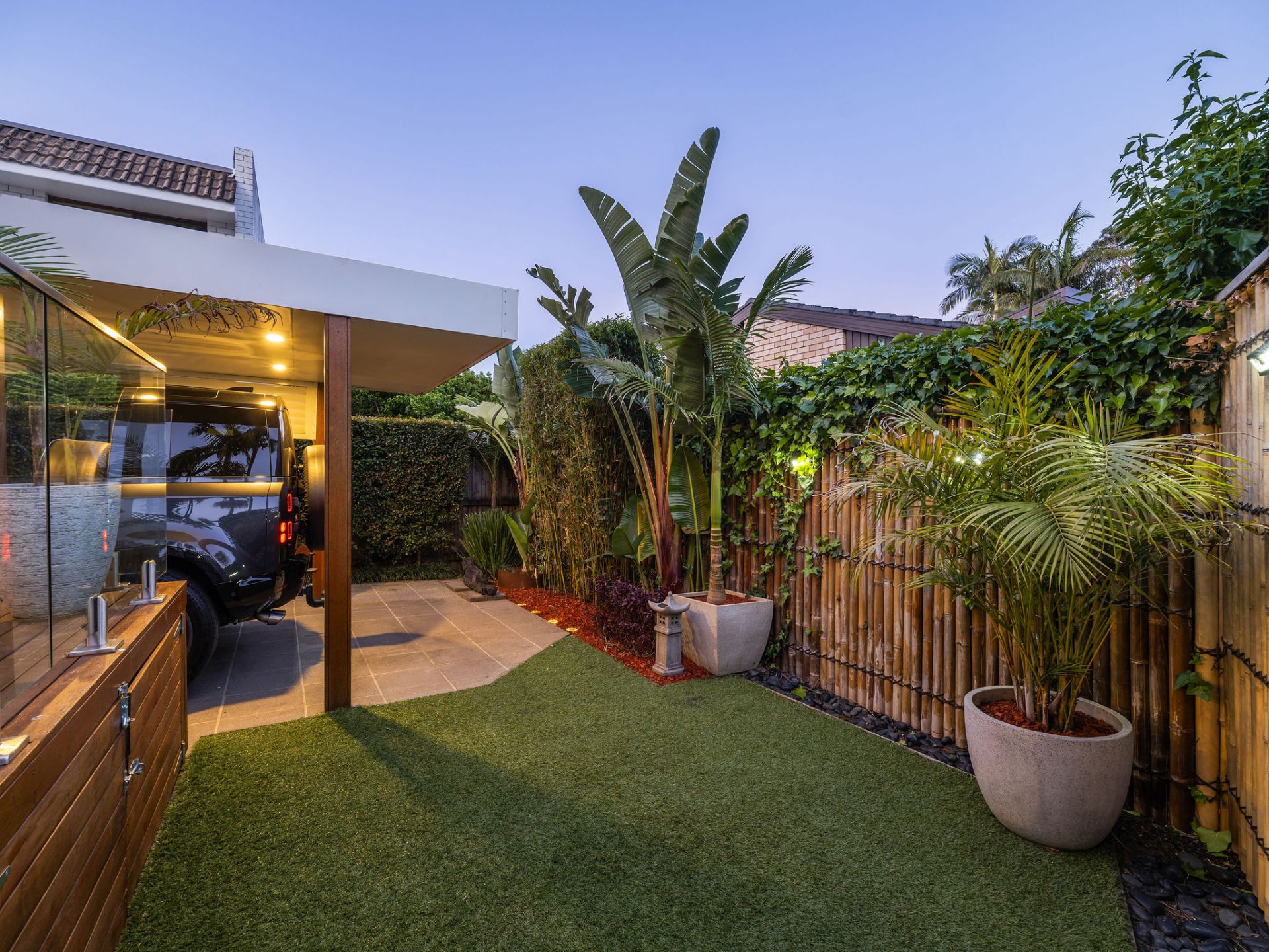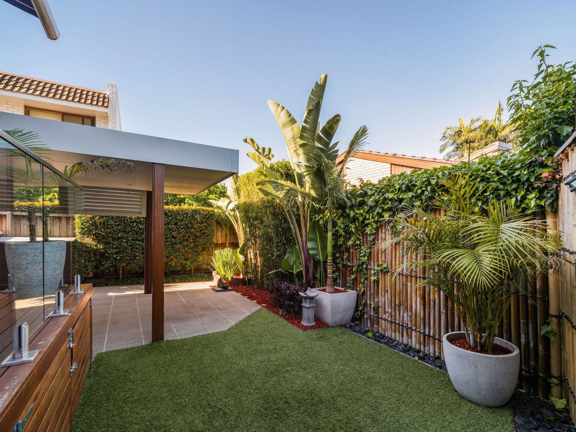 Large courtyard with a BBQ terrace and astro turf