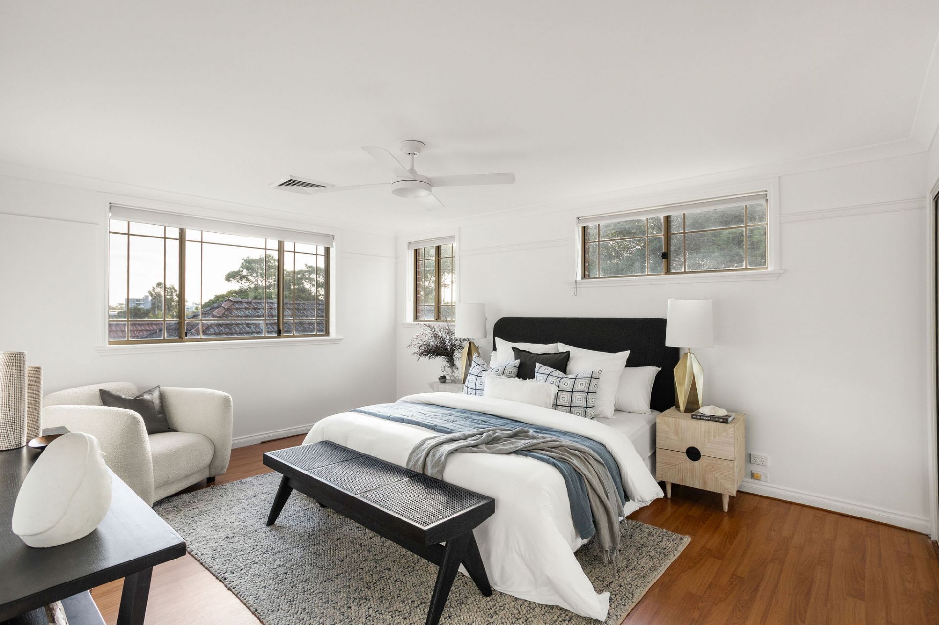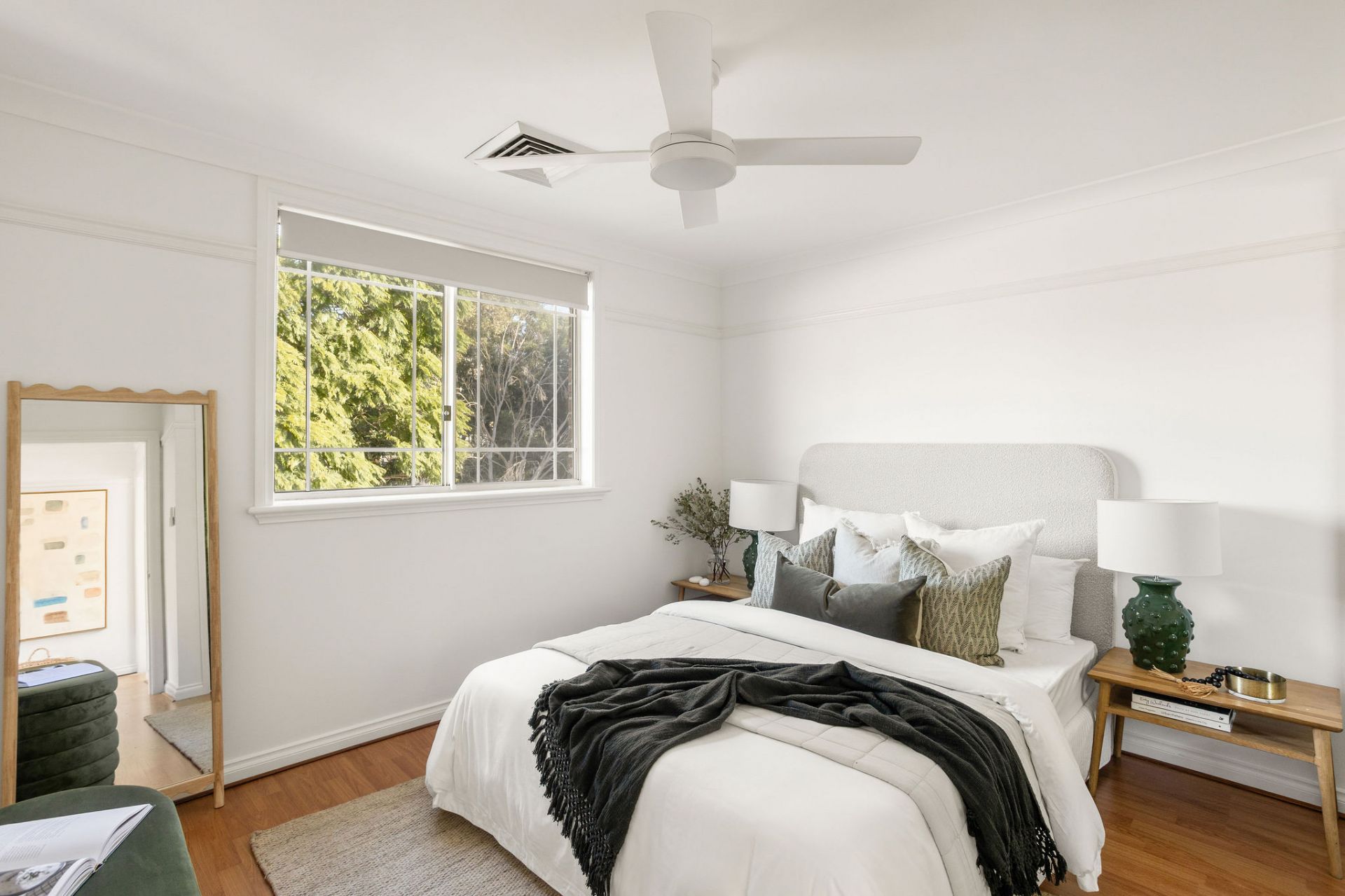 King-sized master bed with leafy district views
