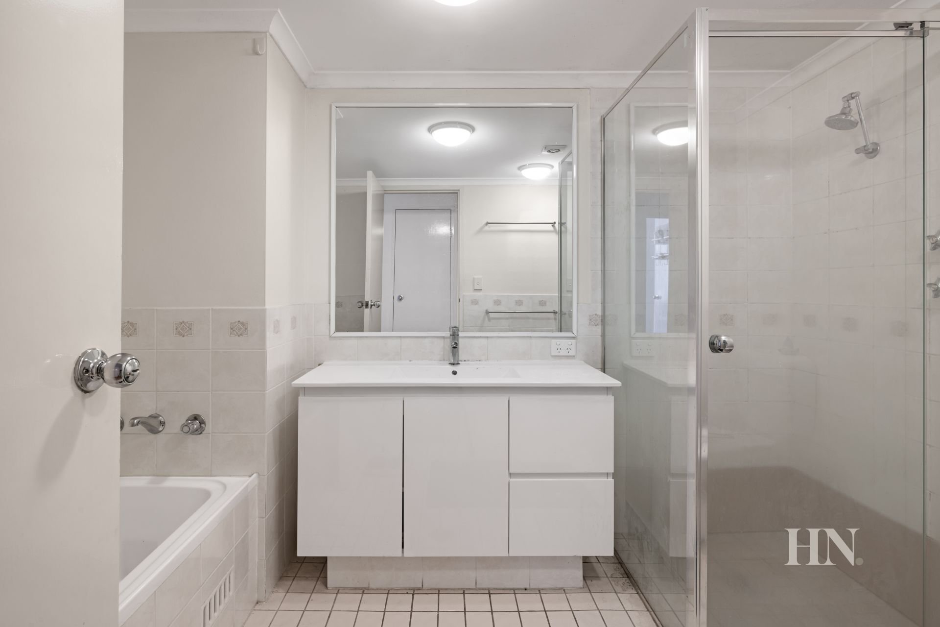 Bathroom features separate bath and shower