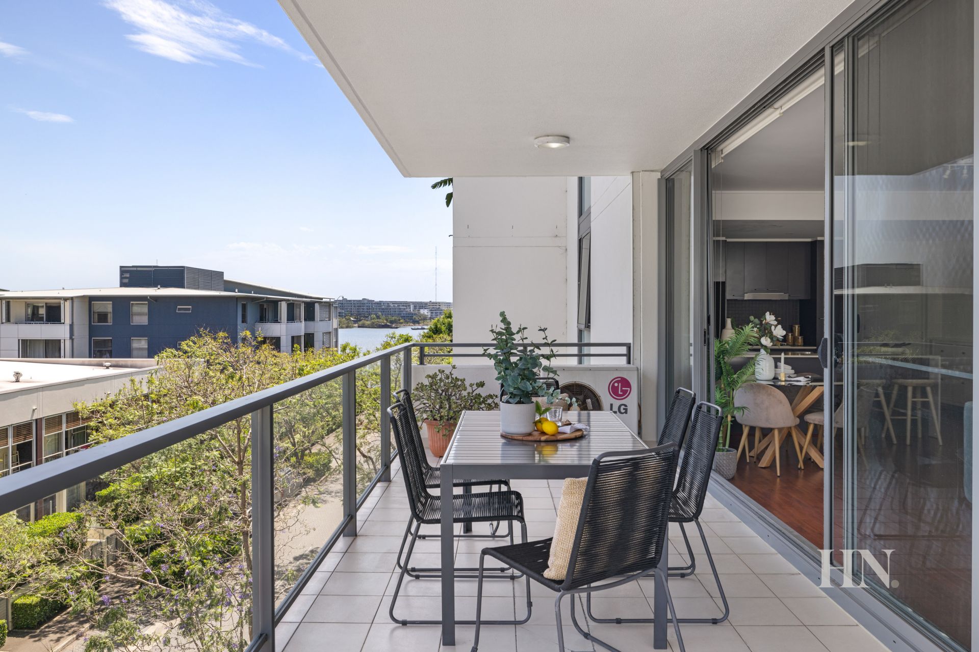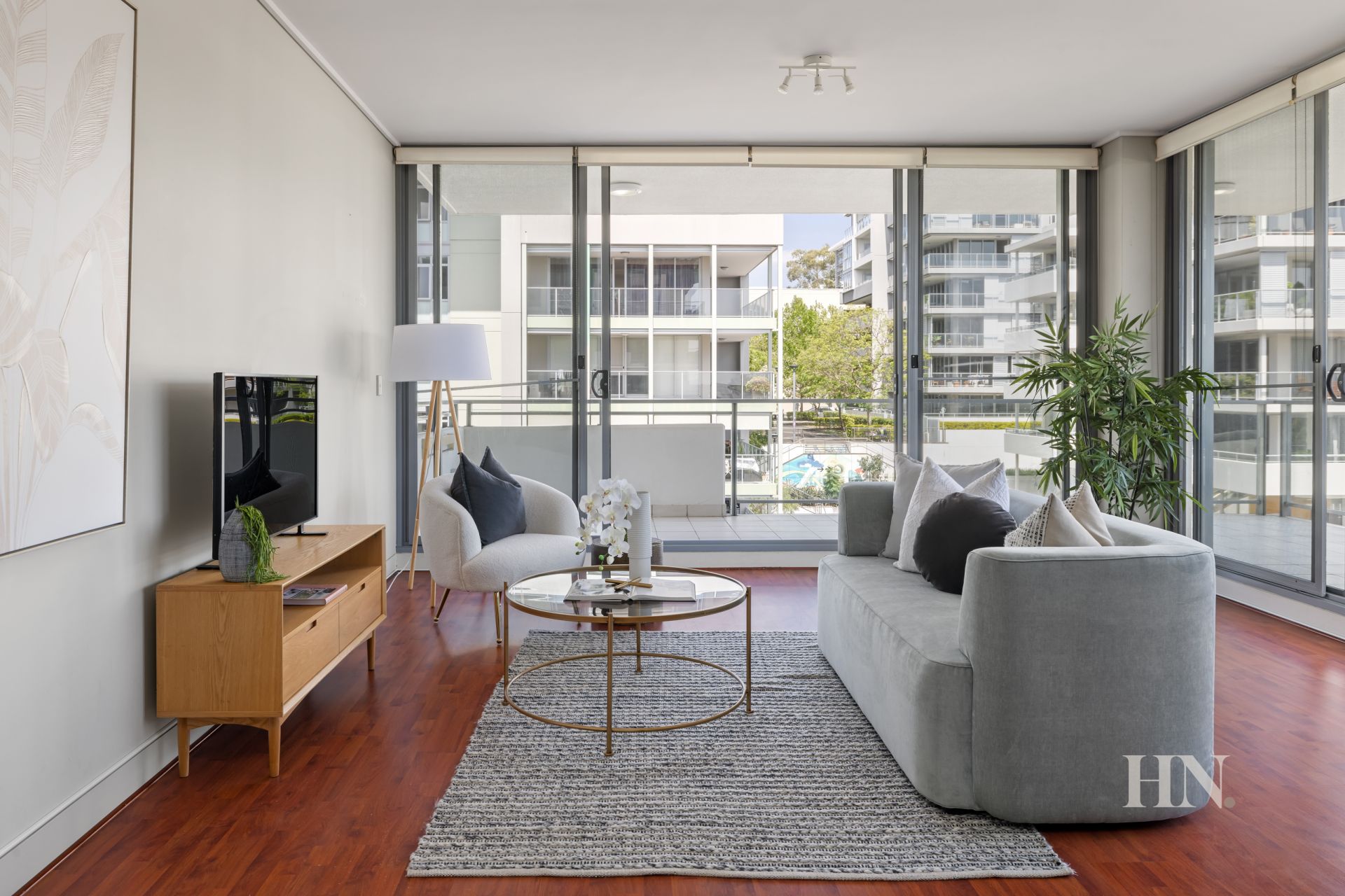 In the heart of Rhodes waterside, with the shopping centre at one end of the street and foreshore walks to parklands at the other, this executive apartment on level four of the ‘Bates Smart’ security building is front and centre for a lifestyle of ease and convenience. It occupies a light filled corner position with generous natural light, designer finishes and a wraparound balcony featuring outlooks towards the water and Wentworth Point. The property includes a study nook with media desk in addition to the bedroom and has secure parking plus storage, while residents of this prestigious building enjoy pocket gardens and resort amenities on site. The perfect private retreat or investment, it’s exceptionally well-positioned for convenient access to everything Rhodes has to offer; shops, cafes and restaurants are just moments from the door, Rhodes Central and the train station are within 10mins walk, and Sydney Olympic Park Ferry Wharf is just 1.4km away across the nearby Bennelong Bridge.
