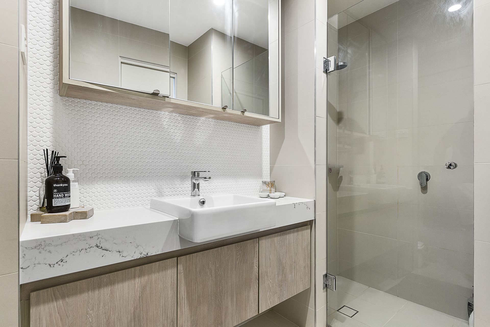 - Modern kitchen appliances and stone benchtops