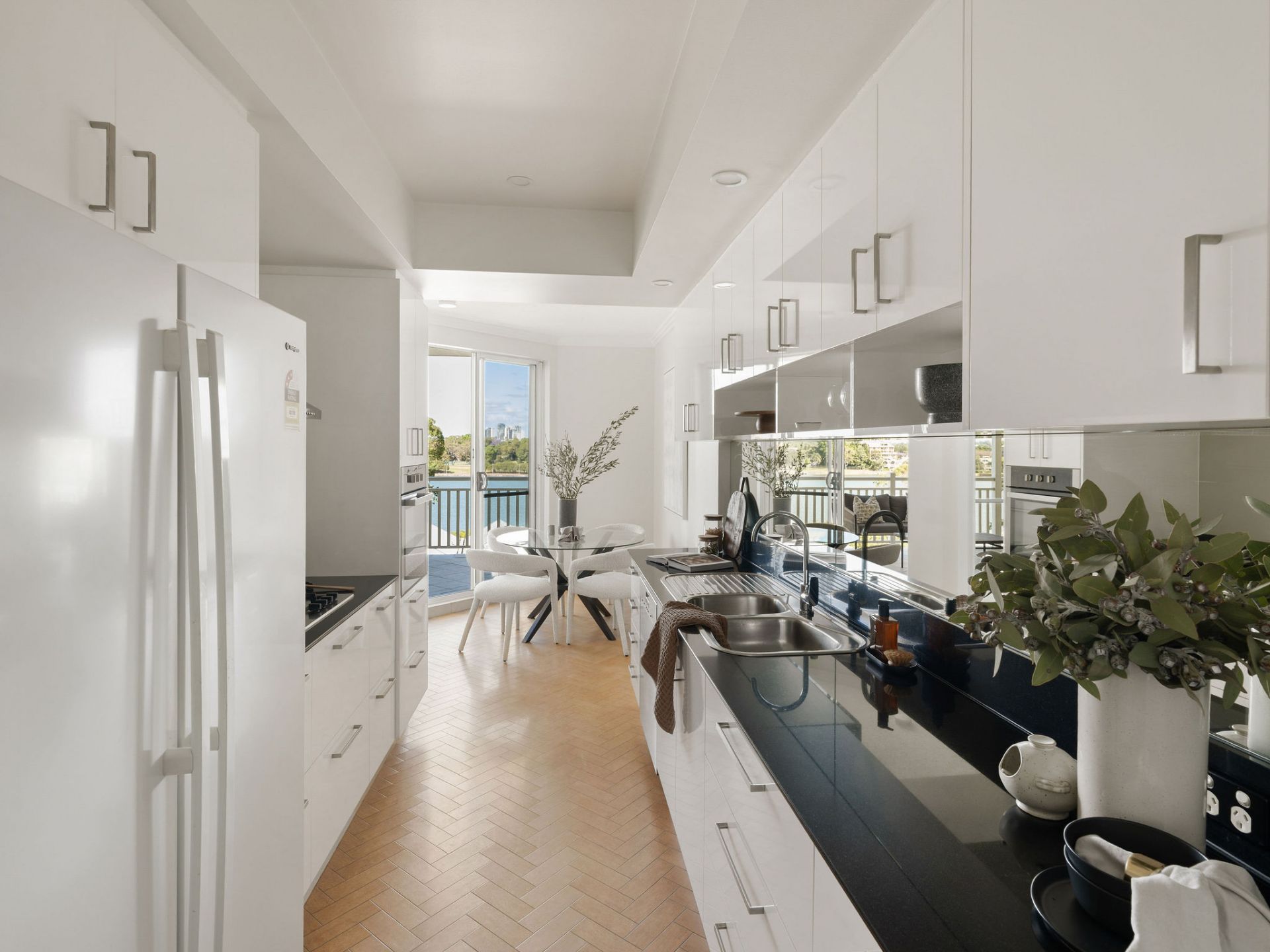 Flowing open plan living overlooks sun filled al fresco and water