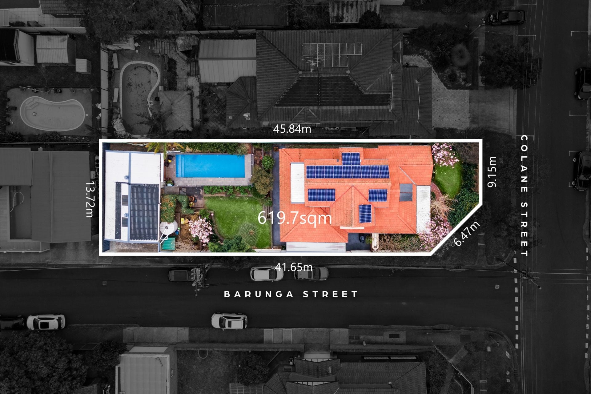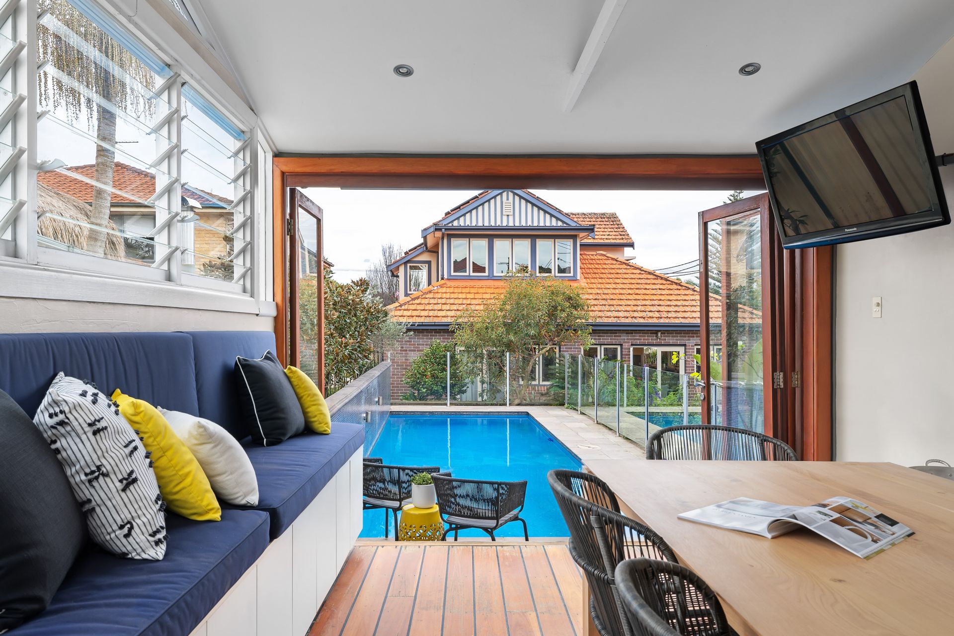 Entertainers yard and pool bathed in natural light
