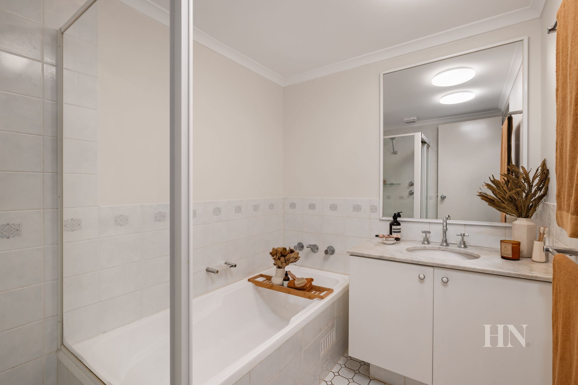 Bathroom includes separate tub and shower