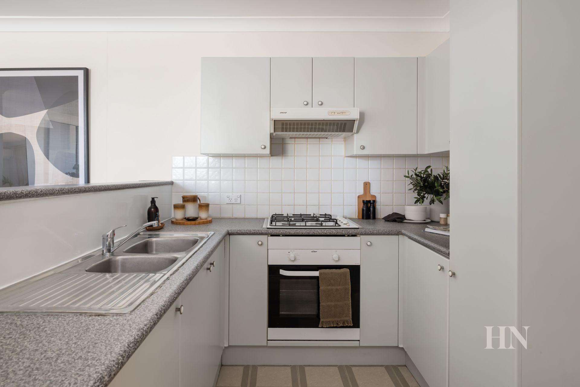 Neat and tidy kitchen with gas cooking