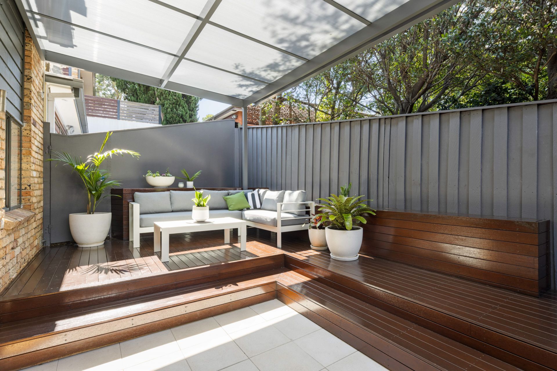 Large courtyard with hardwood timber deck
