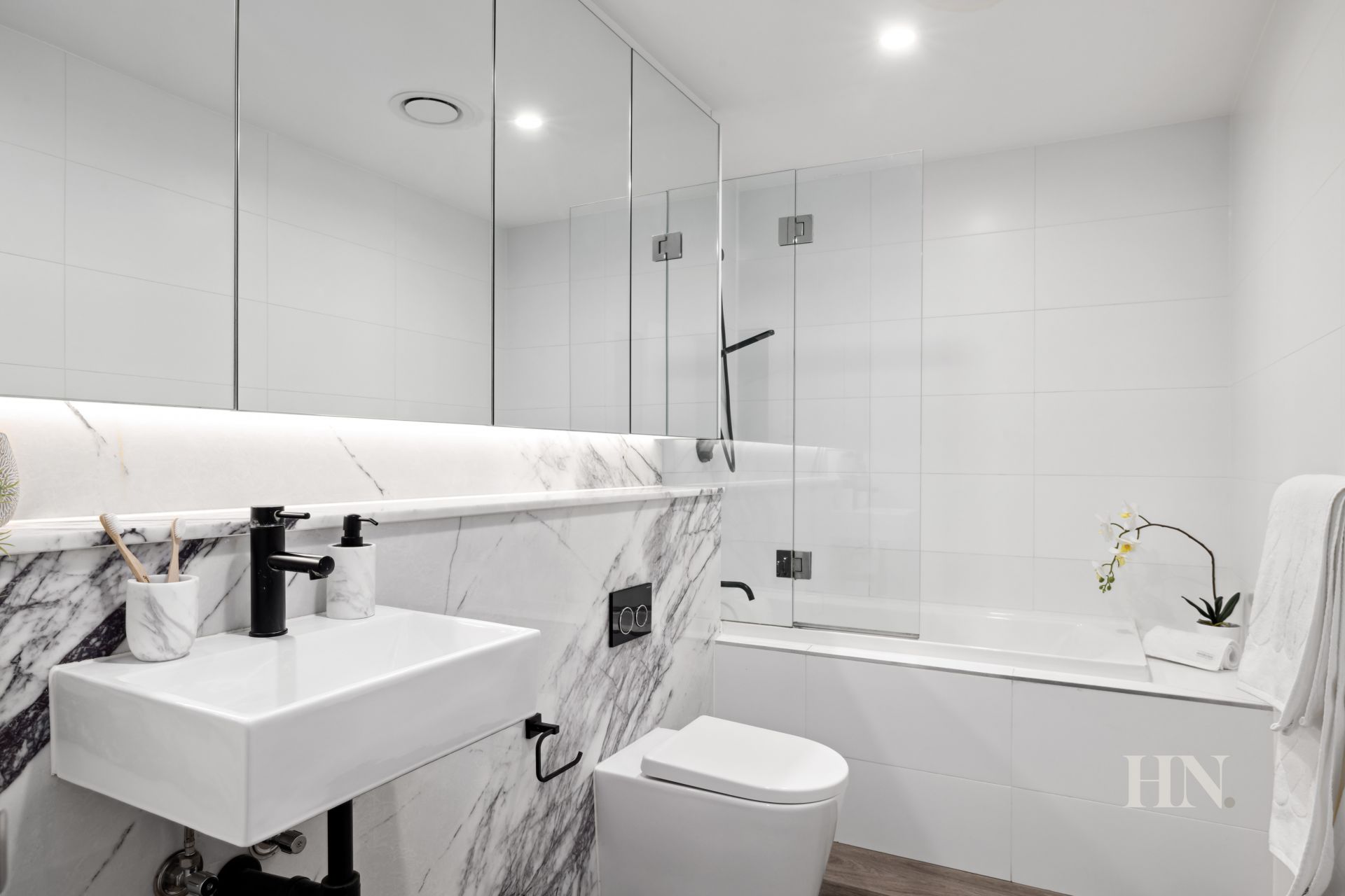 Slick bathrooms, mirrored shaving cabinet