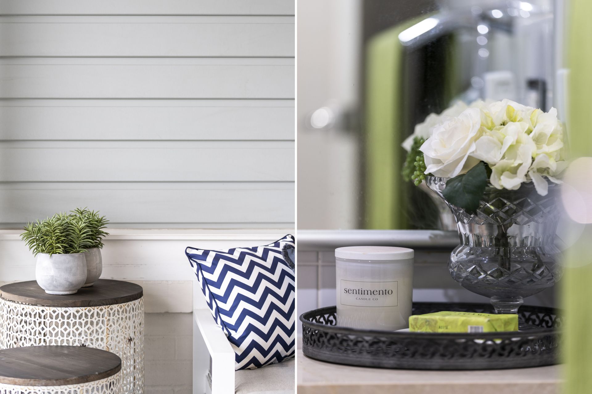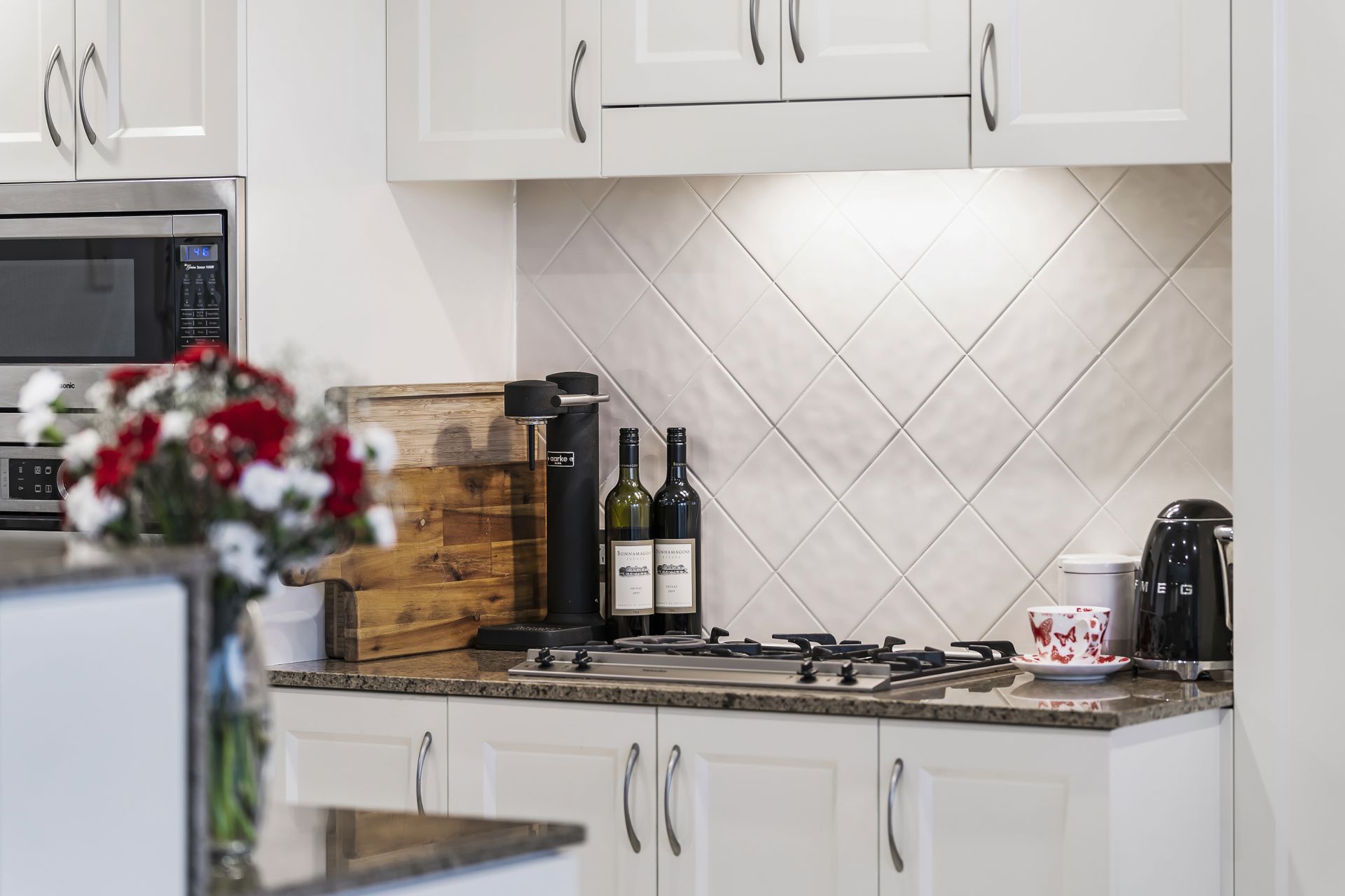 Stone benchtop kitchen with stainless gas cooktop, ample storage