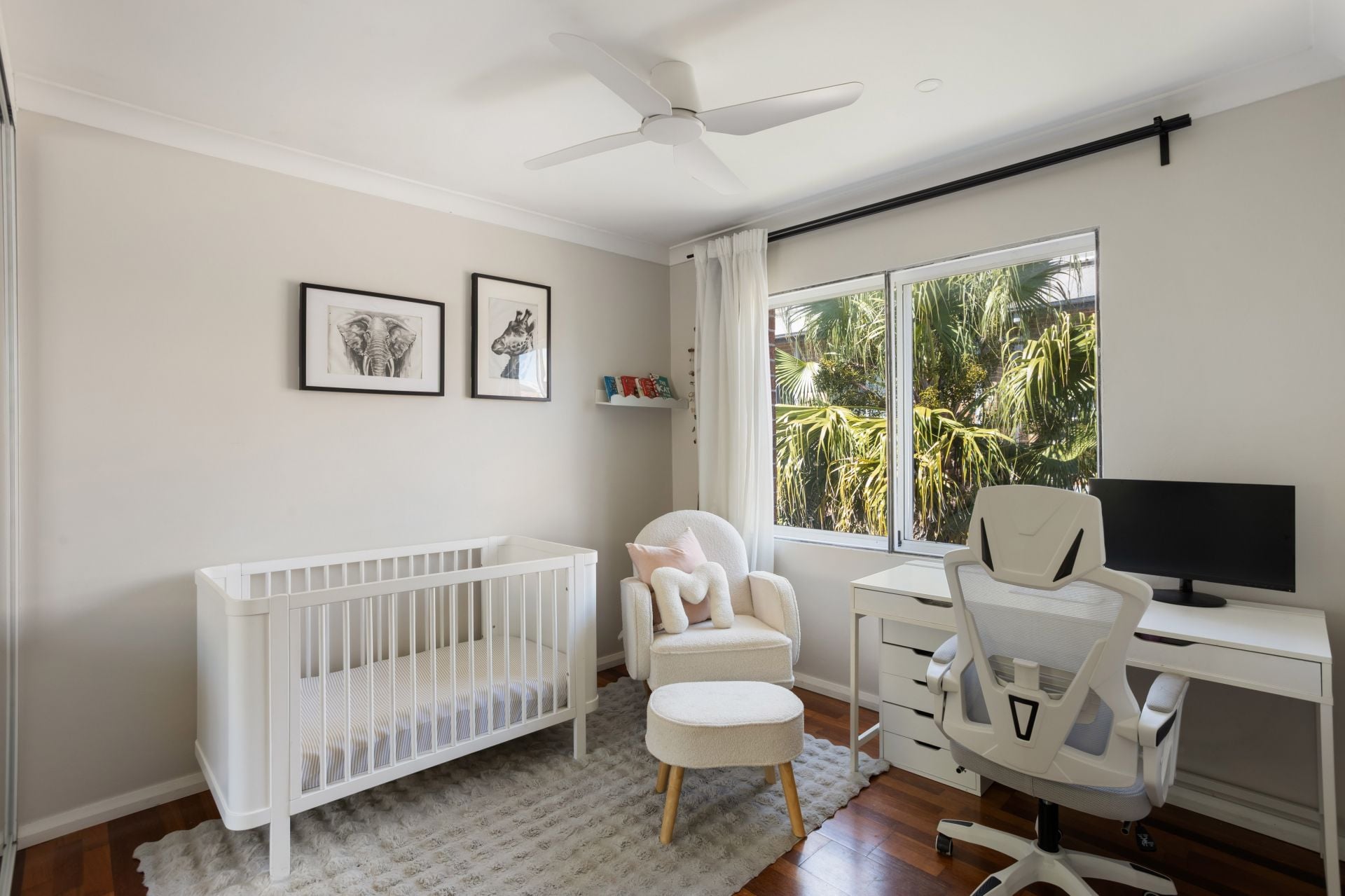Both bedrooms include built-in wardrobes and excellent natural light. Polished timber flooring runs throughout, with air conditioning positioned in the living area and designed to comfortably service the entire home, complemented by ceiling fans.