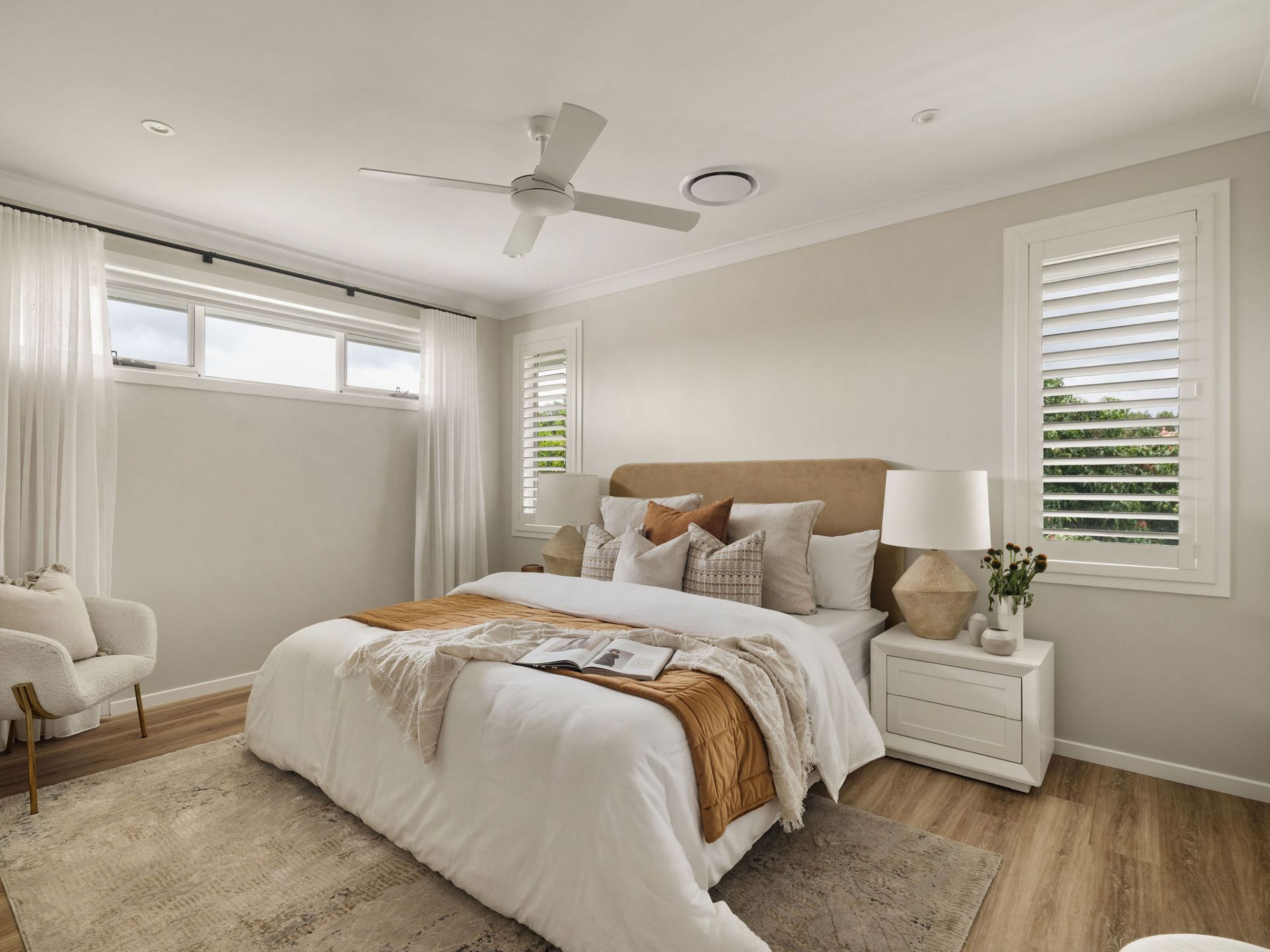 Accommodation is thoughtfully arranged within a dedicated sleep zone upstairs, comprising four generously sized bedrooms, all with built-in robes and ceiling fans. The master suite includes a walk-in robe and ensuite, complemented by a large family bathroom with a separate toilet and excellent linen storage.