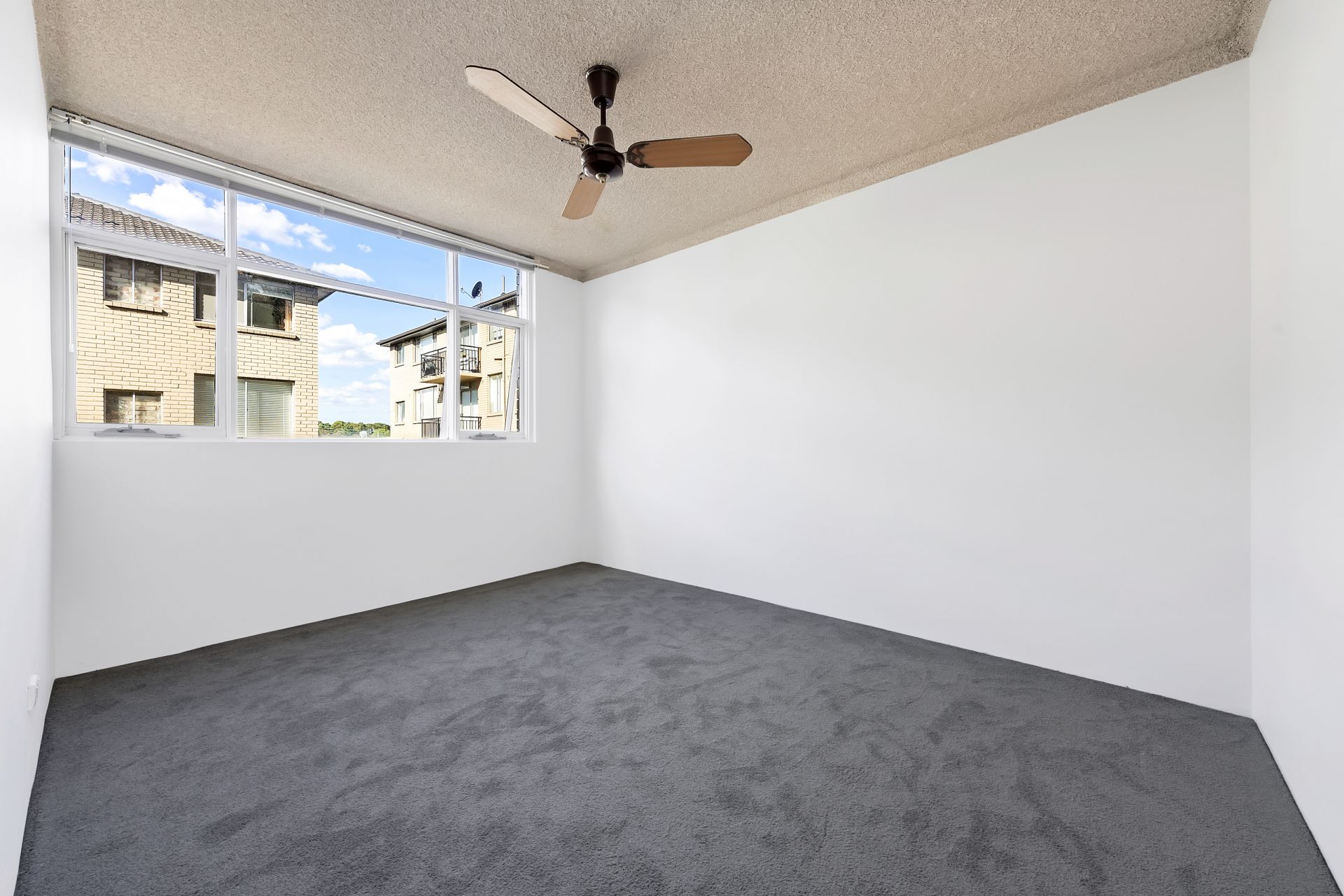 - Two sun filled bedroom main with a fan
