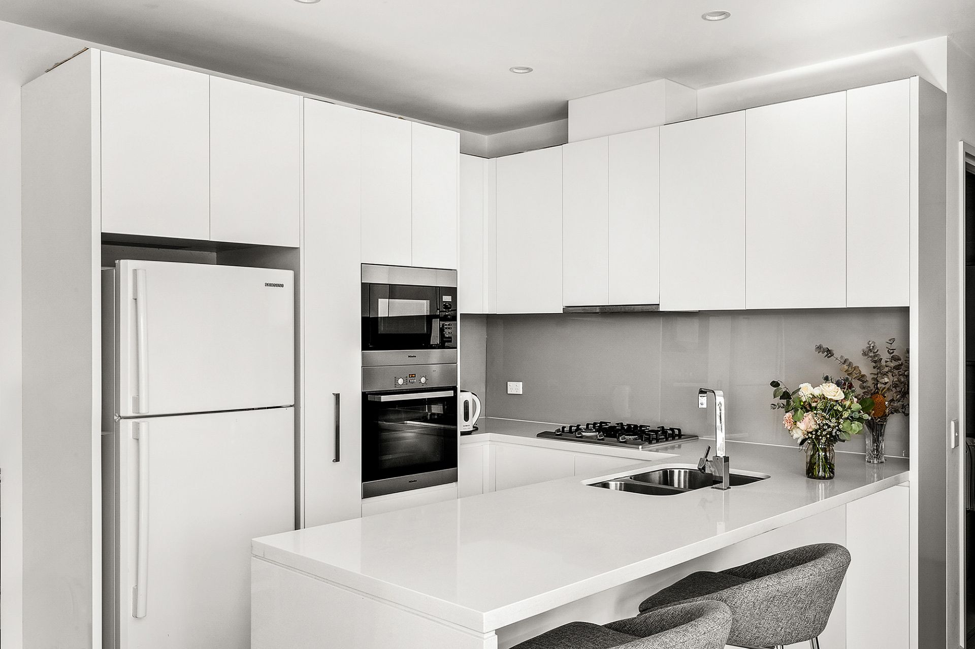 Designer sparkling bench tops and quality appliance featured in the kitchen