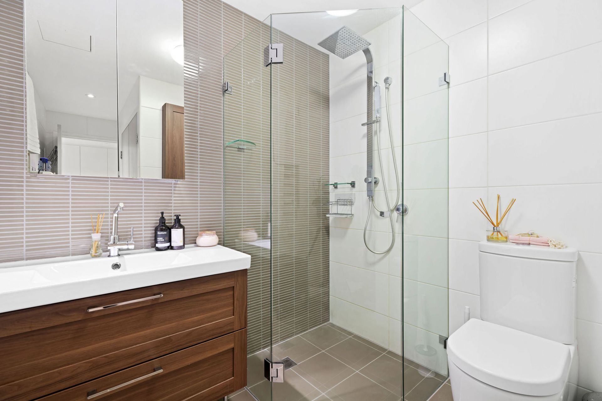Chic tiled bathroom with discreet internal laundry