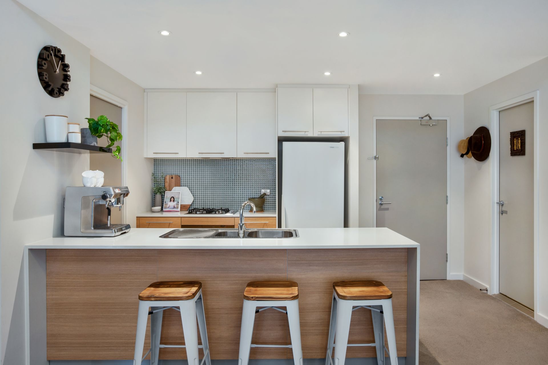 - Gas kitchen with stone benches, stainless steel appliances & breakfast bar