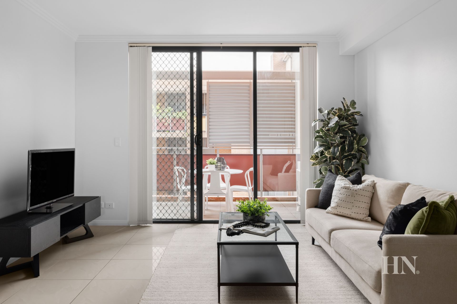 Open living/dining area flows to generous balcony