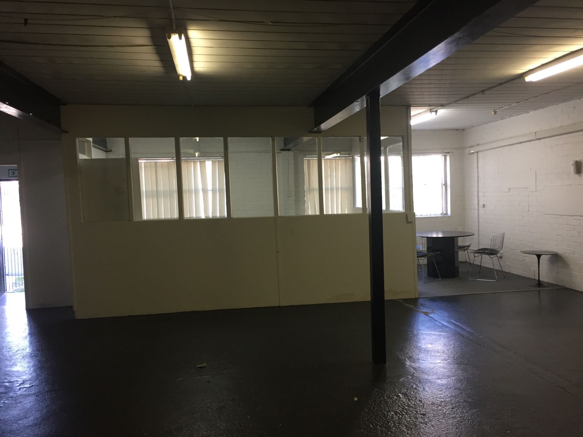 Mostly open plan, ground floor security space of 100sqm (approx 11mx10m) with partitioned office, plus conference area (partly furnished).